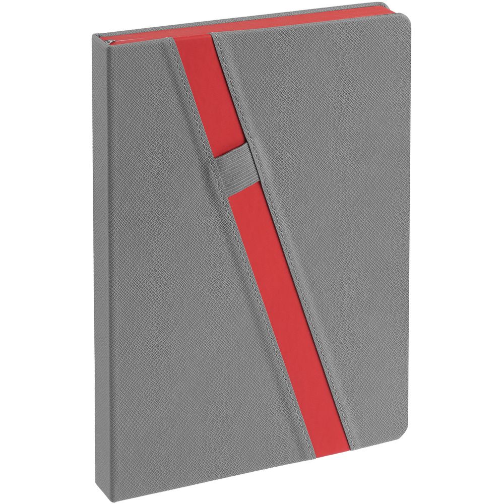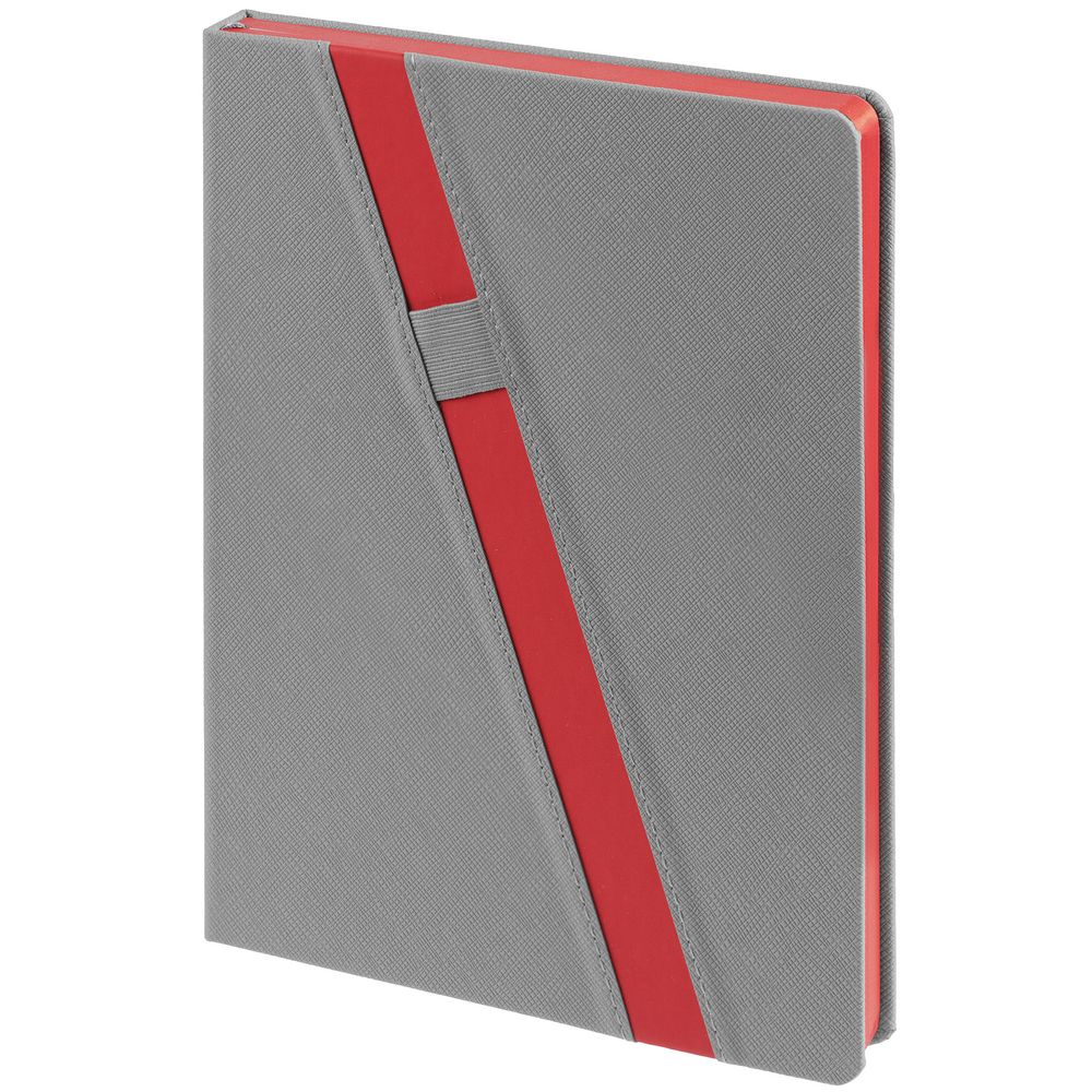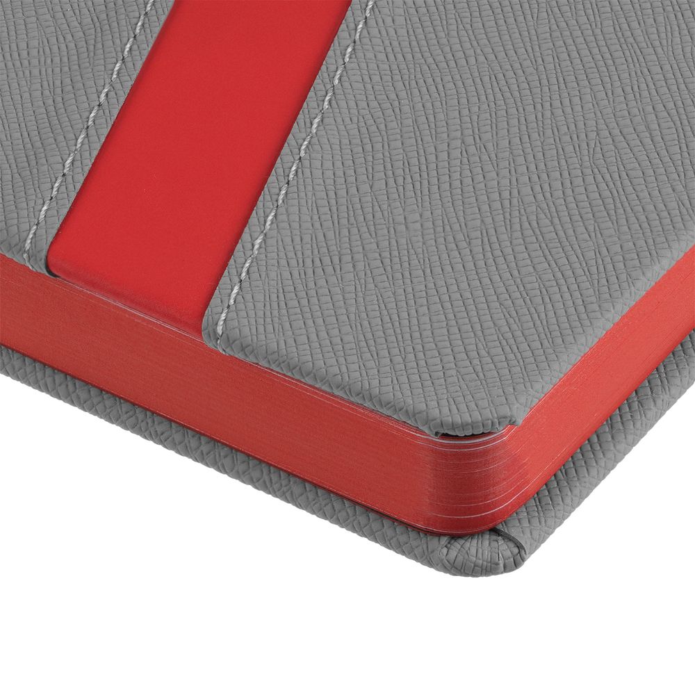 Ежедневник с твердой обложкой и тонированным обрезом. Выполнен из материала Nice Touch, серый СС, и Soft Touch Ultra, красный РР, дополнен серым ляссе.