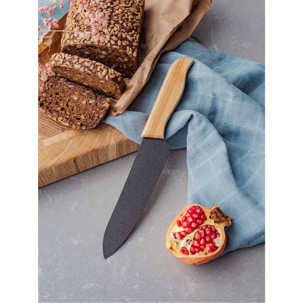 Нож Selva выполнен из керамики и бамбука. Широкий клинок имеет оптимальную форму и режущую кромку, которая не нуждается в заточке. Удобная анатомическая ручка ножа надежно лежит в руке, не скользит, практически не впитывает влагу.