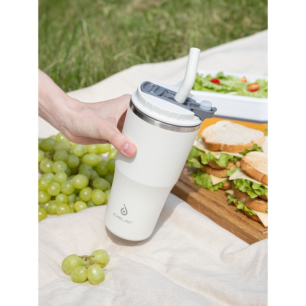 - 2 крышки в комплекте: одна на 100% герметичная с механизмом блокировки отверстия для питья, вторая — с отверстием для трубочки