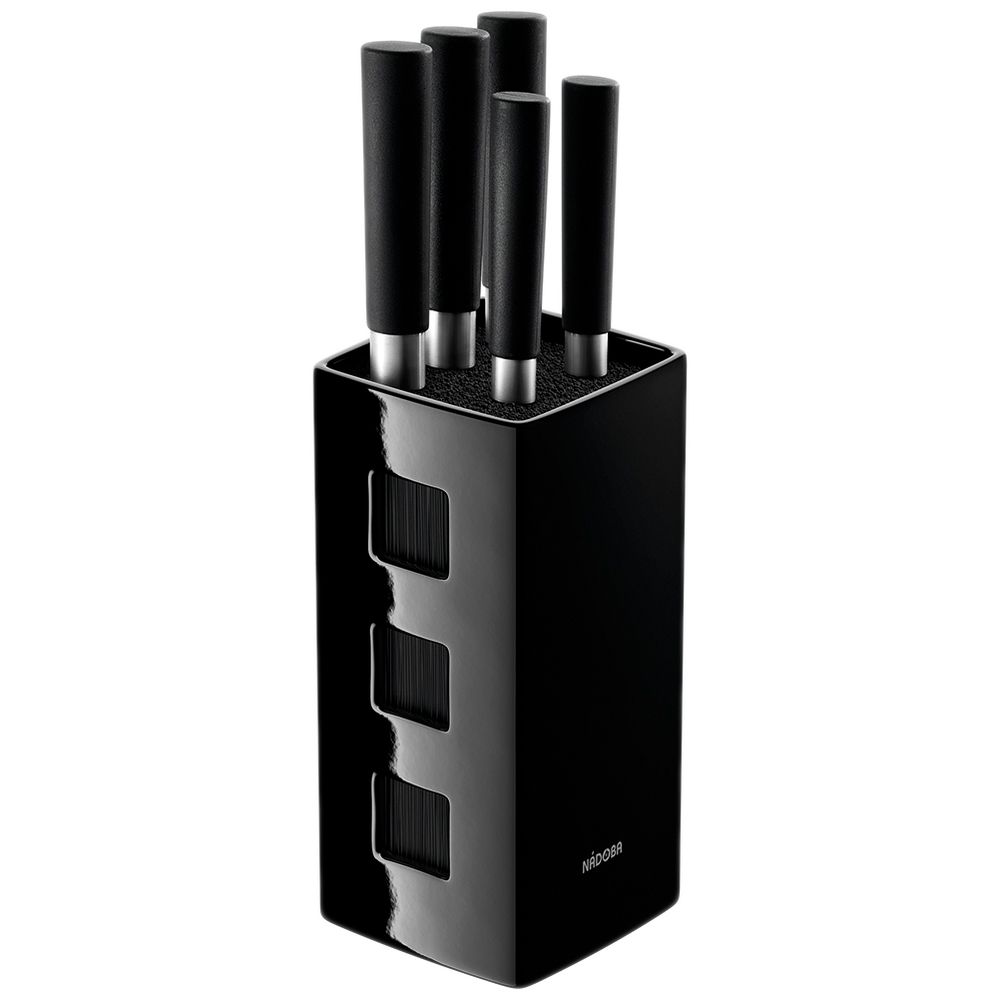 Набор из 5 кухонных ножей в оригинальной подставке из керамики станет не только помощником на кухне, но и ее главным украшением. Внутри блока находятся пластиковые волокна, которые позволяют хранить ножи в произвольном порядке и различном количестве, они не тупят лезвия и легко моются.В наборе: