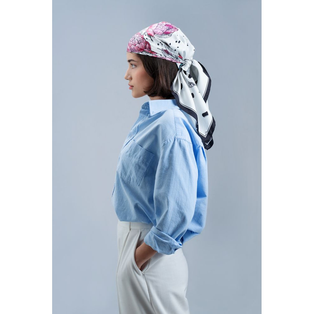 Шелковый платок с цветочным принтом открывает простор фантазии — его можно использовать как шарф, головной убор или декоративный элемент для верхней одежды и аксессуаров.