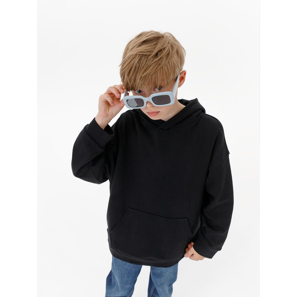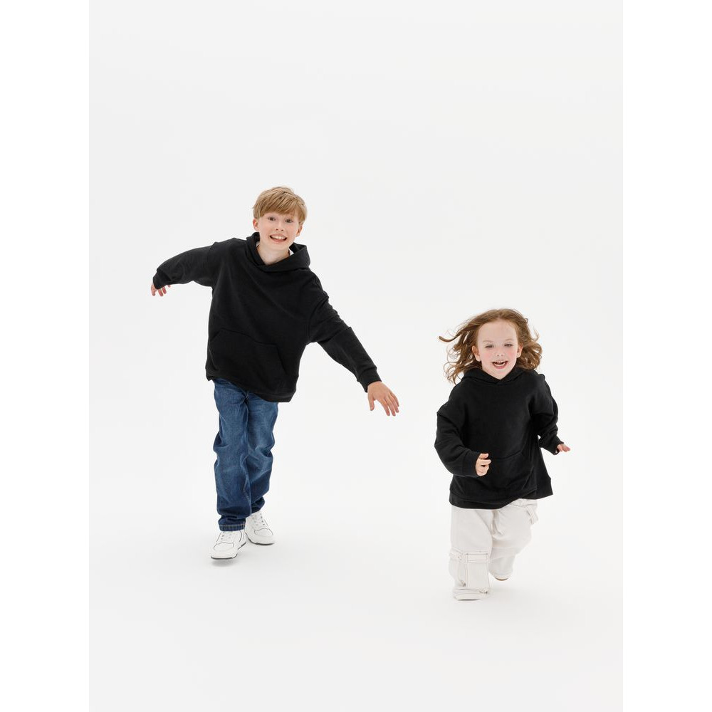 Детское худи оверсайз со спущенным плечом и карманом-кенгуру.