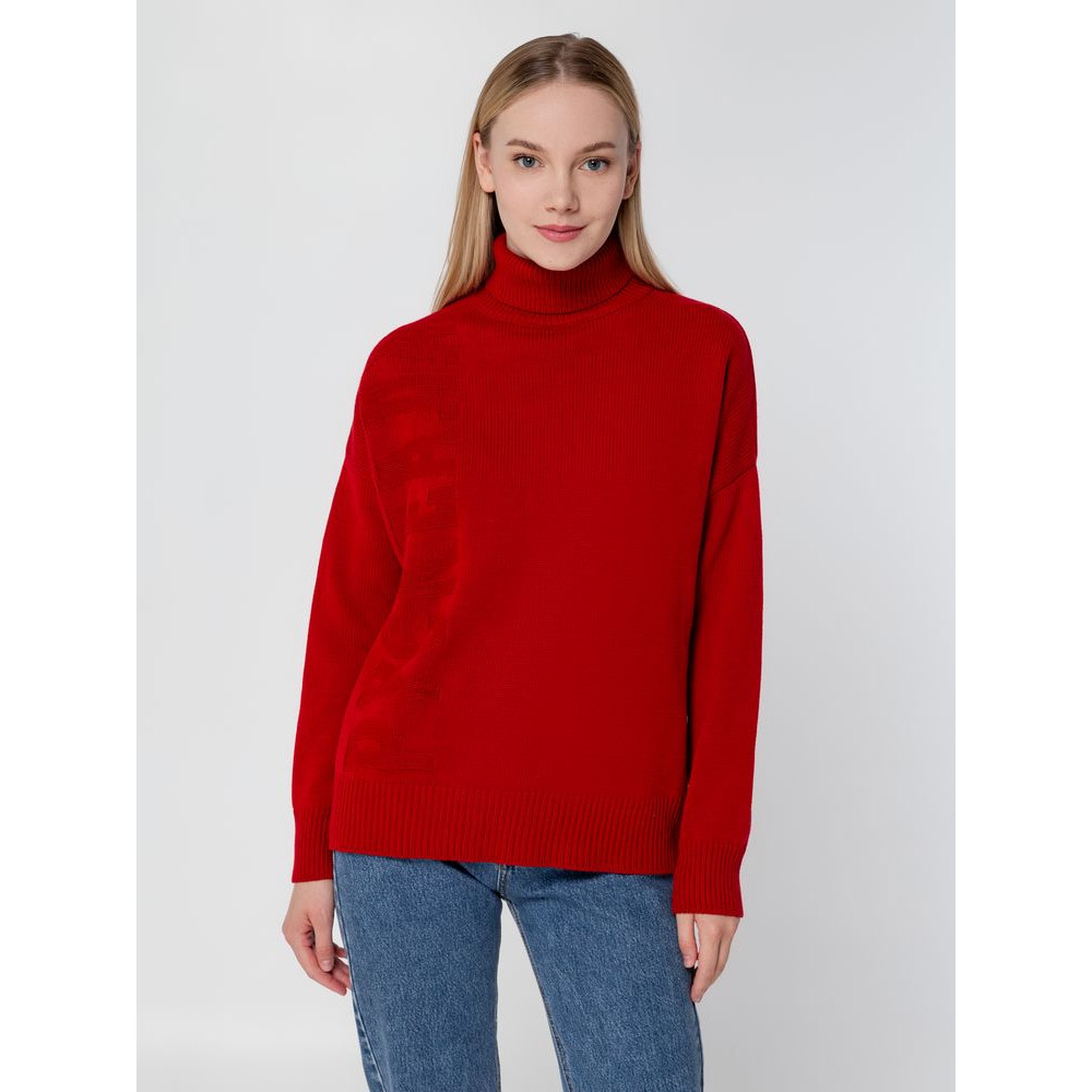 Однотонный свитер с фактурным вывязанным логотипом в фирменном цвете вашей компании.