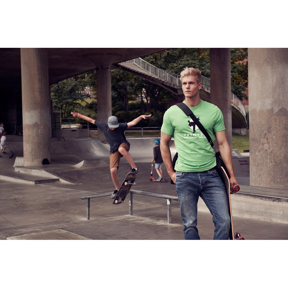 Мужская футболка с уплотненными швами на плечах и двойным швом с эластаном. Четырехслойная резинка на воротнике предохраняет его от растяжения.