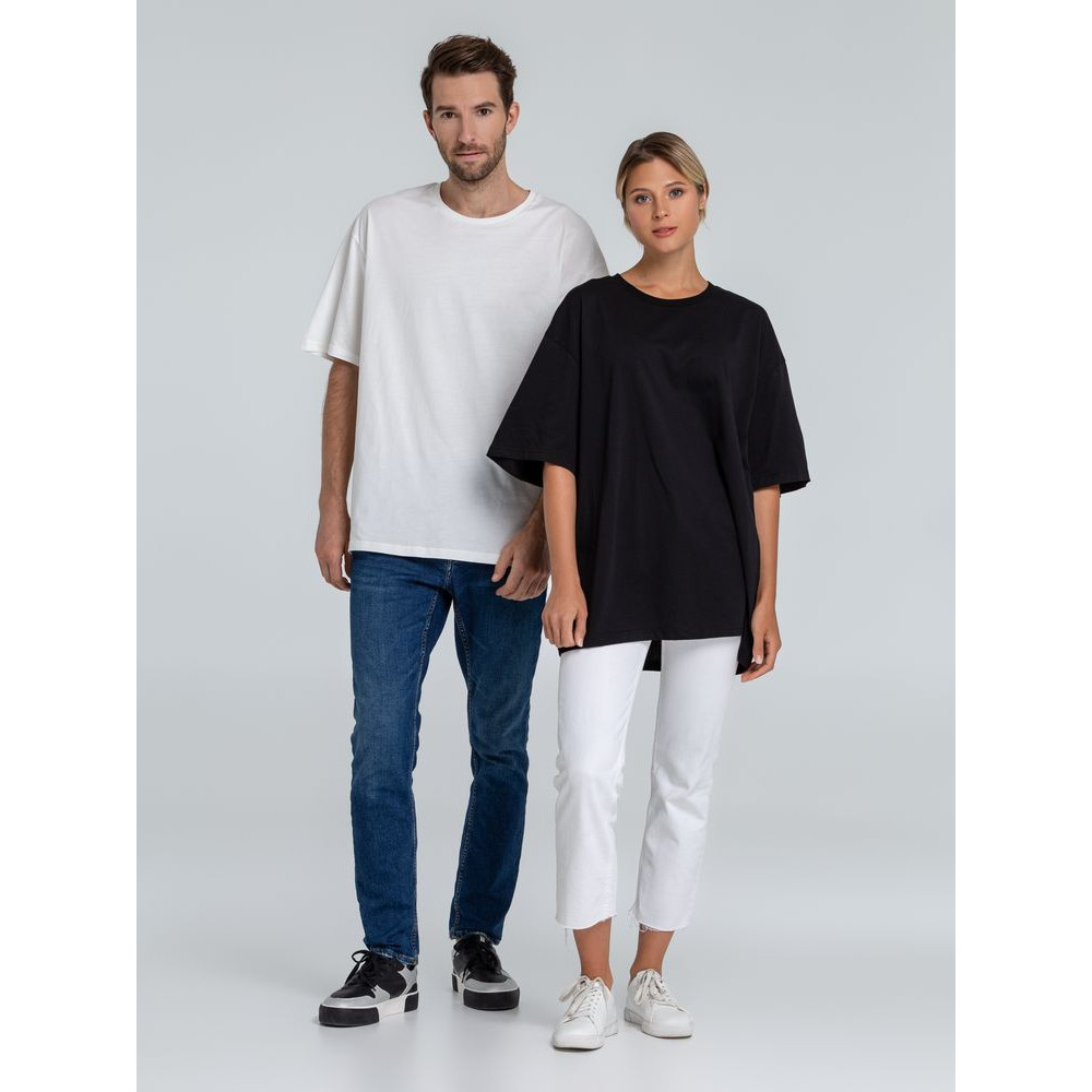 Футболка унисекс со спущенным плечом и круглым вырезом, отделанным резинкой.