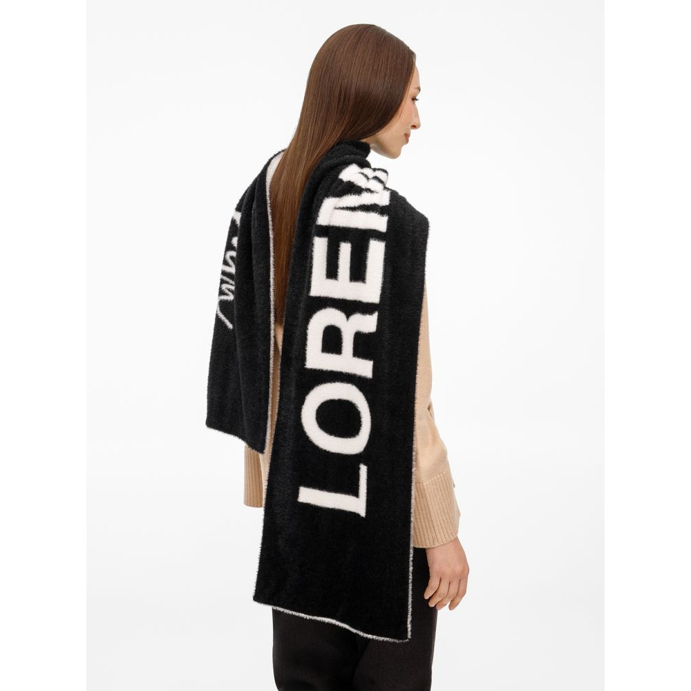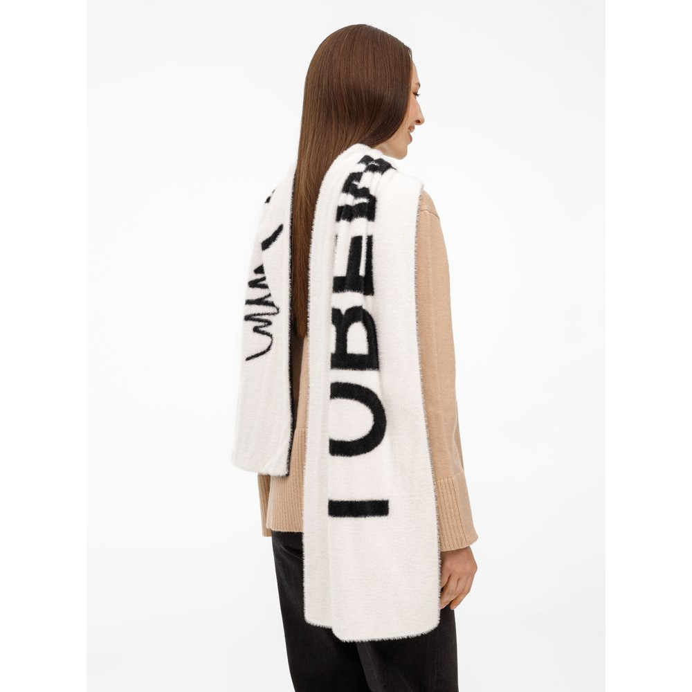 Шарф из пушистого нейлона с вывязанным логотипом и индивидуальным рисунком в черно-белой гамме.