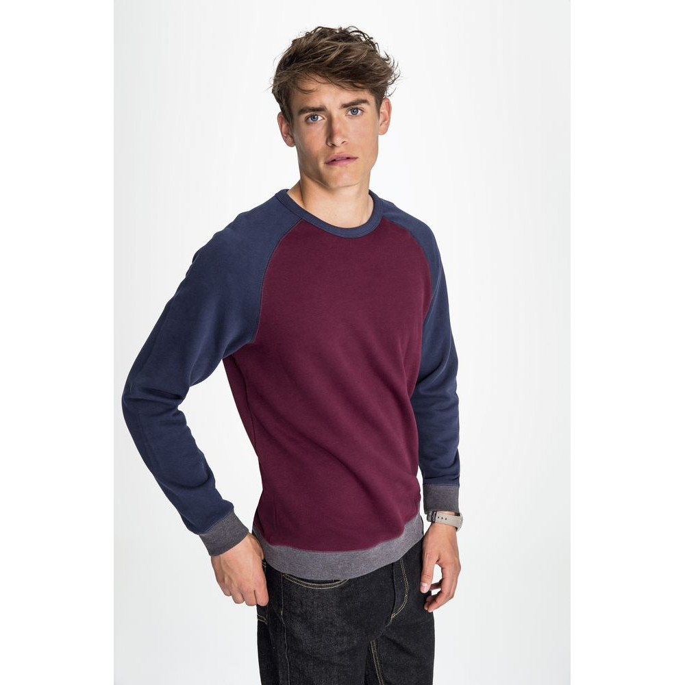 Трехцветный свитшот в стиле 80-х с рукавом реглан. Лейбл производителя в боковом шве изнутри, в шве горловины — только бирка с размером, что позволяет вам нанести свой логотип.