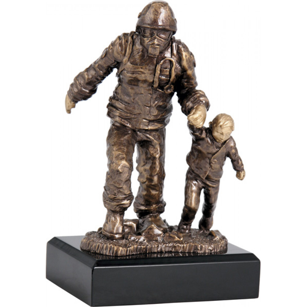 Фигурка литая "Пожарный". Цвет бронза. Высота 19,5 см. Представляет собой пожарного, который ведет за руку ребенка. Фигурка установлена на цоколе в форме квадрата, цвет черный.