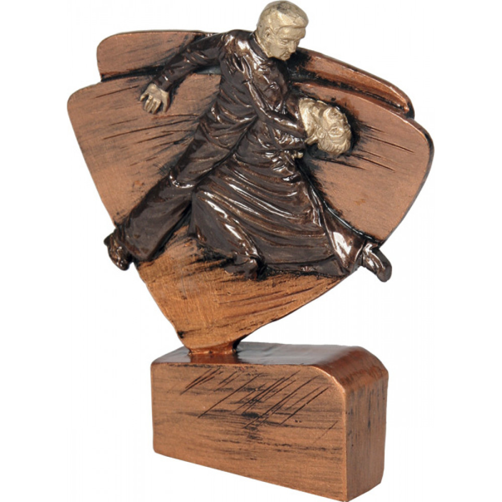 Фигурка литая "Танцы". Цвет бронза. Высота 11,5 см. Представляет собой треугольник со скругленными углами и сторонами, установленный на прямоугольную подставку. По центру треугольника изображена танцевальная пара в бальном танце.