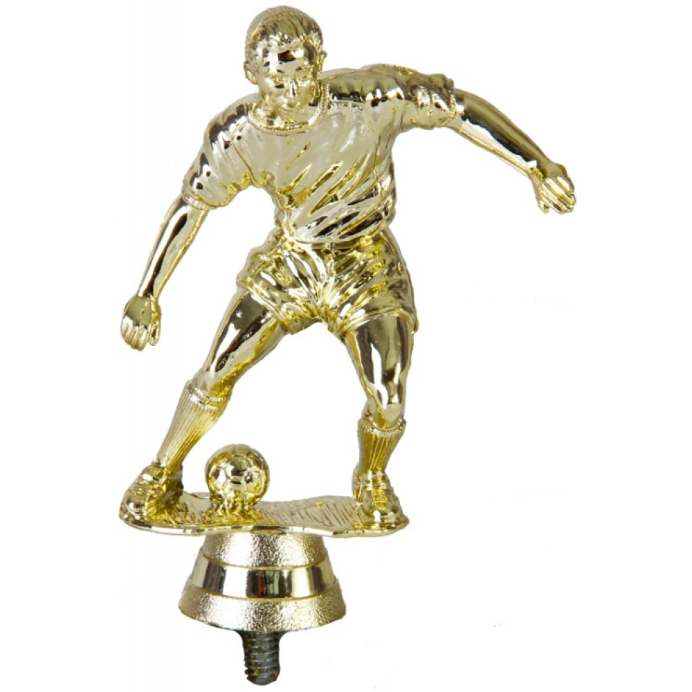 Цвет: золото, материал: пластик. Вид спорта: футбол. Фигурка выполнена в виде футболиста, готового к удару. Его ноги согнуты в коленях и расставлены на ширине плеч. Правая рука согнута в локте, левая вытянута вдоль тела. Футболист нагнулся к земле, от чего на футболке появились складки, шорты немного приподнялись вверх из-за бега. Игрок сконцентрировано смотрит на свою цель, не отводя взгляда. Левая нога немного повёрнута в сторону мяча, а правая прижата к земле. Ниже - круглое основание, на котором имеются горизонтальные линии. Футболист находится на тонкой закруглённой по краям пластине – имитацией футбольного поля. Высота, см: 11.4 Вес, кг: 0.04. Фигурку возможно закрепить на цоколь, постамент или кубок.