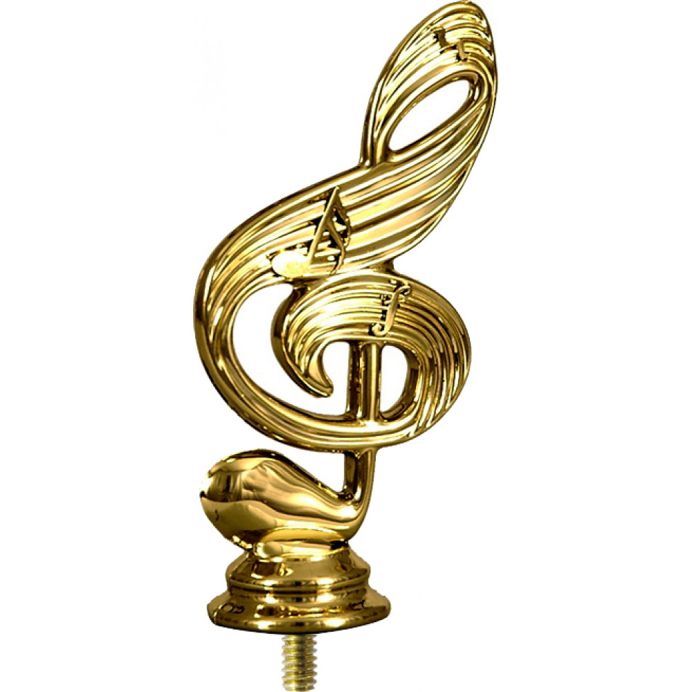 Фигурка пластиковая "Музыка". Цвет золото, высота 12 см. Представляет из себя скрипичный ключ, оформленный вдавленными линиями, огибающими всю фигуру. В центре скрипичного ключа на его поверхности нанесена шестнадцатая нота (с двойным флажком) и буква "f". Скрипичный ключ расположен на небольшом возвышении конусообразной формы. Фигурку возможно закрепить на цоколь, постамент или кубок.