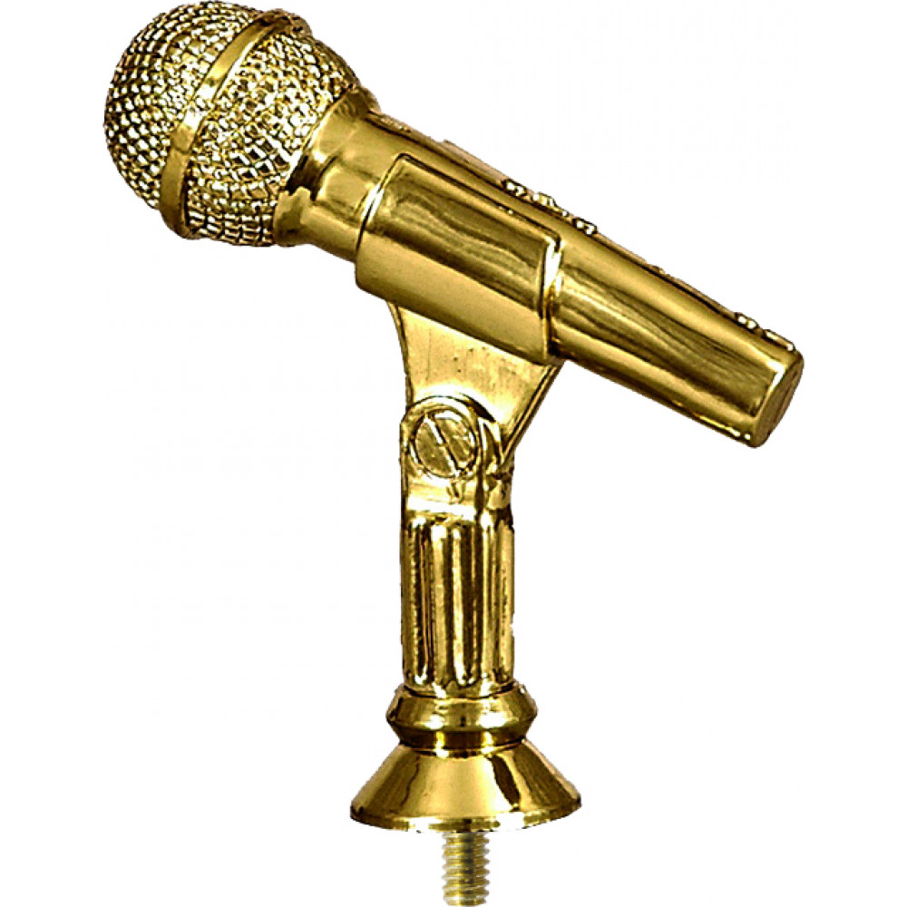 Фигурка пластиковая "Микрофон". Цвет золото. Высота 7 см. Микрофон с круглой головкой, оформленный в виде металлической сетки с тонкой полосой по середине головки. Микрофон установлен на стойку с держателем под углом 45 градусов. ¶Конструкция установлена на пластиковом конусообразном элементе. Фигурку возможно закрепить на цоколь, постамент или кубок.
