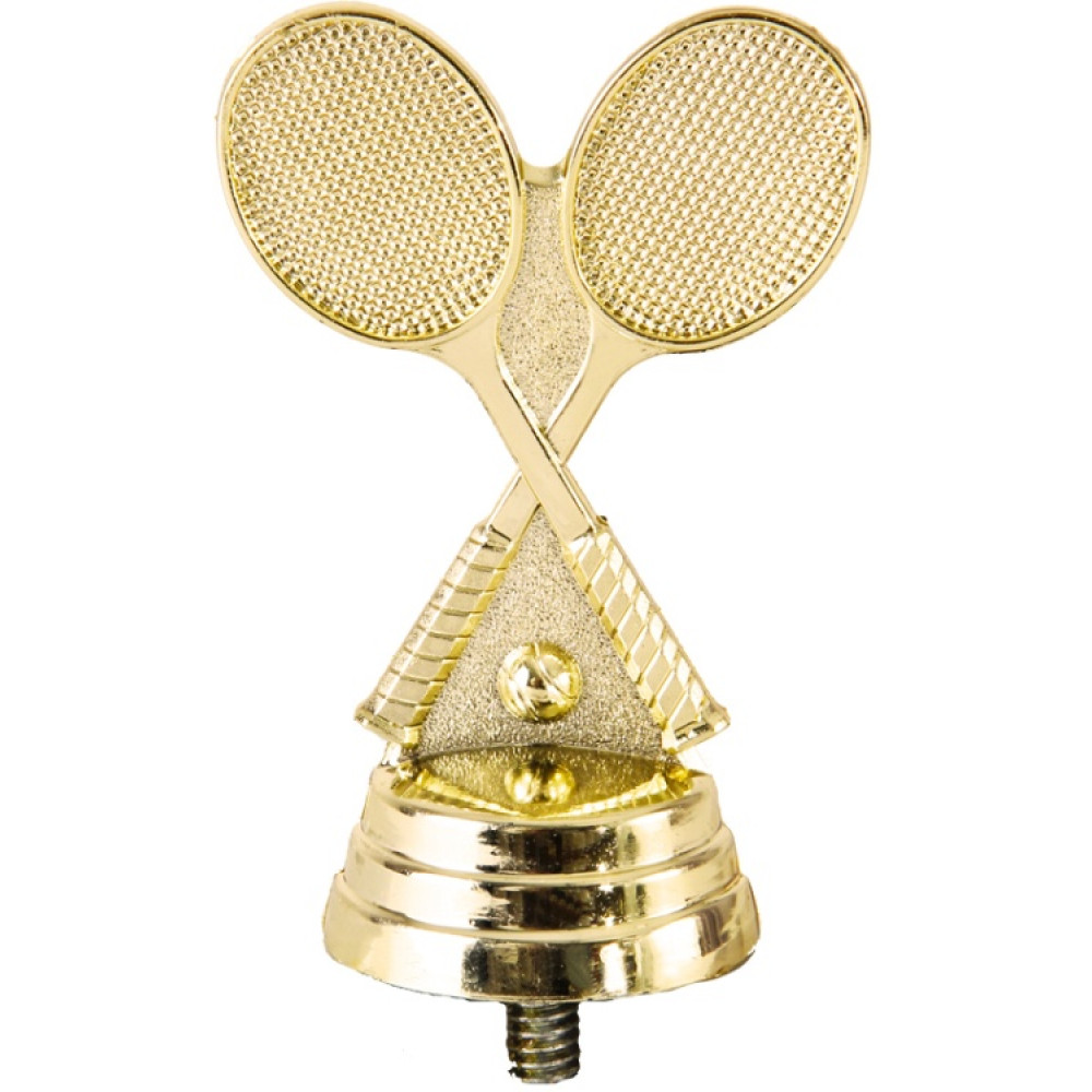 Цвет: золото, материал: пластик. Вид спорта: большой теннис. Фигурка выполнена в виде двух скрещенных в центре ракеток. Ниже имеется элемент в виде мячика для игры в теннис. Кажется, что от мячика вниз падает тень. Фигурка выполнена в золотом цвете, что придаёт ей роскоши и уникальности. Ниже - круглое основание, на котором имеются горизонтальные линии. Высота, см: 7.6 Вес, кг: 0.02. Фигурку возможно закрепить на цоколь, постамент или кубок.