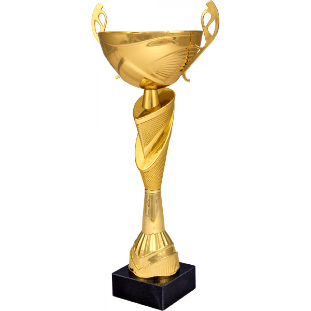 Кубок состоит из трех элементов: чаша, стем, цоколь. ¶Чаша кубка изготовлена из стали с гальваническим покрытием, цвет внутри и снаружи - золото. Чаша с орнаментом по окружности чаши, чередующиеся горизонтальные полоски с выпуклым треугольником, вверху чаши выпуклая линия расположенная волной по всей окружности чаши. К чаше прикреплены ручки, выступающие за ее края. Ручки в форме узора, поверхность гладкая. Стем кубка изготовлен из металлизированного пластика. Цвет-золото. ¶Верхняя часть стема представлена вытянутым вертикально элементом, поверхность пупырчатая, в верхней части гладкий кант, по центру элемента расположена "ступенька", которая так же имеет гладкий кант. Нижняя часть стема имеет конусообразную форму. Внизу расположен вогнутый элемент в форме "галочки".¶Цоколь кубка имеет квадратную форму. Материал - мрамор. Цвет - черный.