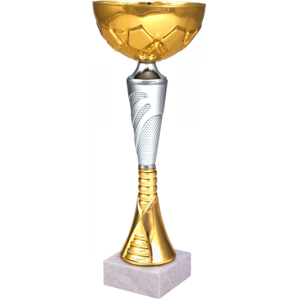 Кубок состоит из трех элементов: чаша, стем, цоколь. ¶Чаша кубка изготовлена из стали, с гальваническим покрытием. Цвет внутри и снаружи - золото. Форма чаши - полушар. Чаша имеет рельеф по всей окружности в виде выпуклых фигур, напоминающих граненные самоцветы. Рельеф расположен у основания чаши. ¶Стем состоит из трех частей. Верхняя часть стема кубка представлена в форме короткого конусообразного элемента с гладкой поверхностью, цвет - серебро. Средняя часть стема серебряного цвета, имеет форму перевернутого конуса. Поверхность элемента представлена мелкими частыми точками, в верхней части расположен узор в виде широких полос, идущих по диаметру. Нижняя часть стема золотого цвета, имеет конусообразную форму. Имеет узор в виде рельефных окантовывающих линий, идущих по всей высоте элемента. В центральной и нижней части линии огибает широкий элемент с гладкой поверхностью.¶Цоколь кубка имеет квадратную форму. Материал - мрамор. Цвет - белый, неоднородный.