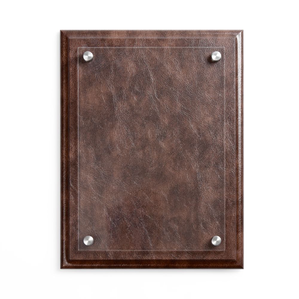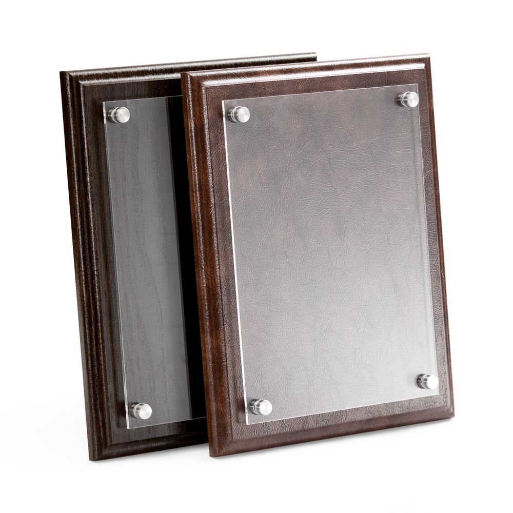 Классическая плакетка с имитирующей кожаную текстуру основой и акриловой вставкой — универсальный инструмент, чтобы рассказать о достижениях команды.