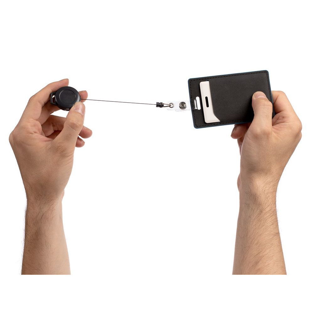 На ретрактор можно поместить бейдж, визитку или магнитную карту. В корпусе спрятан сворачивающийся шнур, который позволяет при необходимости демонстрировать содержимое держателя, не снимая его.