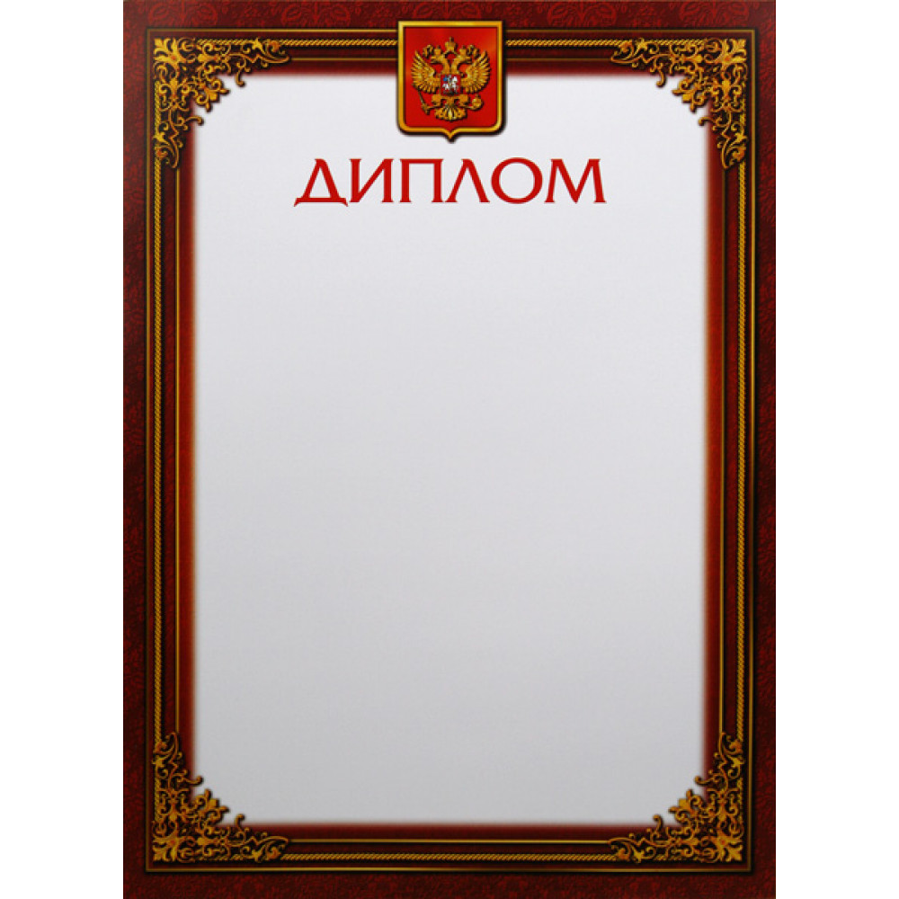 Диплом, формат А4. Бумага матовая, толщина 200 гр, полноцветная печать. ¶Диплом с белым фоном и темно-бордовой рамкой. В верхней части написано слово "Диплом" красным цветом, над словом изображен российский герб. Рамка бордовая с узором, с золотой тонкой переплетенной линией с растительным узором на углах.