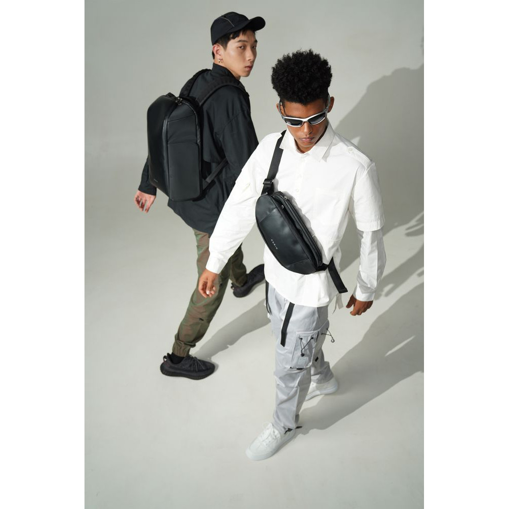 Модная эргономичная наплечная сумка FlipSling cделана из инновационного водоотталкивающего материала, устойчивого к порезам, трению и другим механическим воздействиям, в комбинации с искусственной кожей.