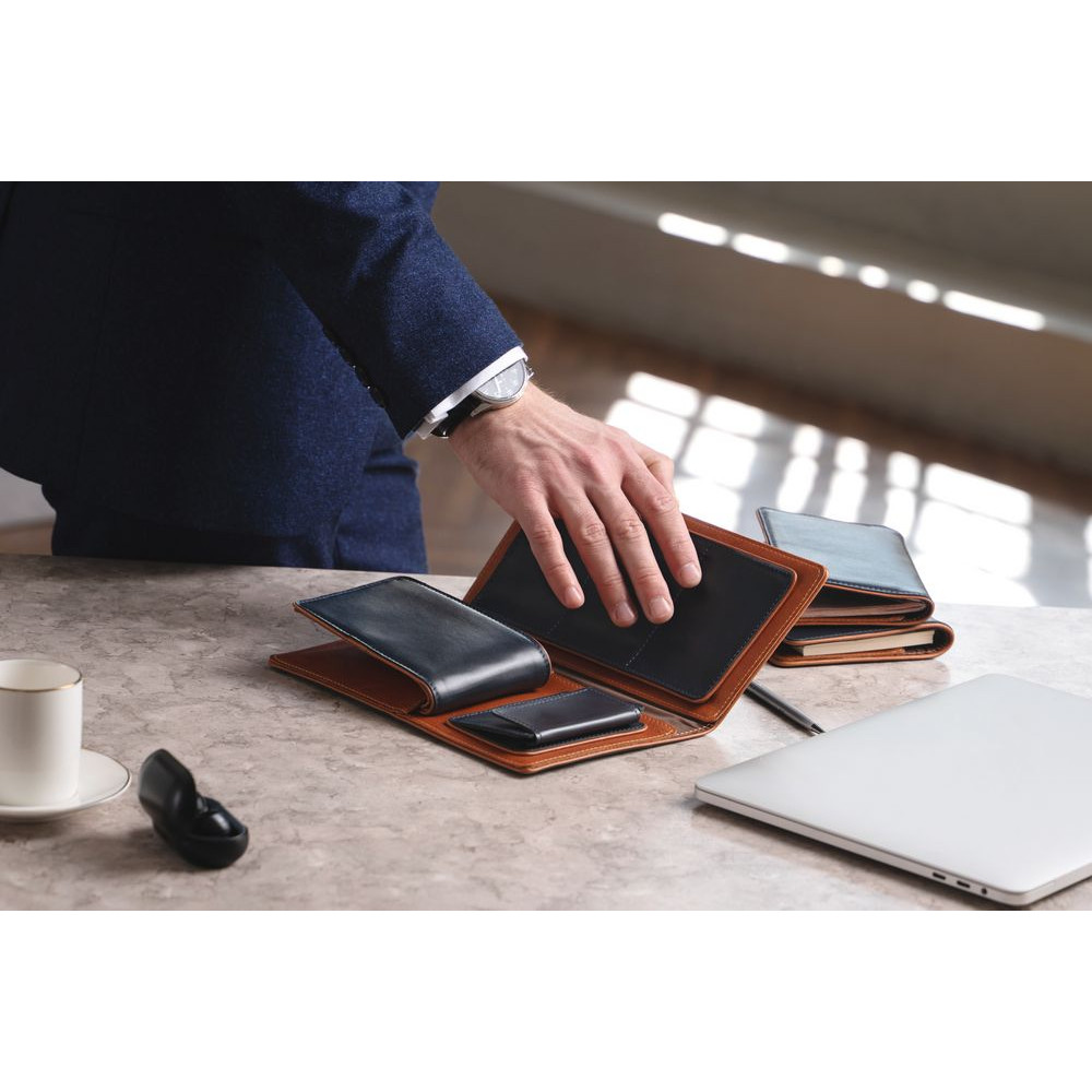 Чтобы передать этот удивительный контраст, для изделий Kalsa Palermo была выбрана гладкая натуральная кожа: глубокого синего цвета снаружи и светло-коричневого оттенка внутри. Оформленные в едином стиле, они легко собираются в подарочные наборы.