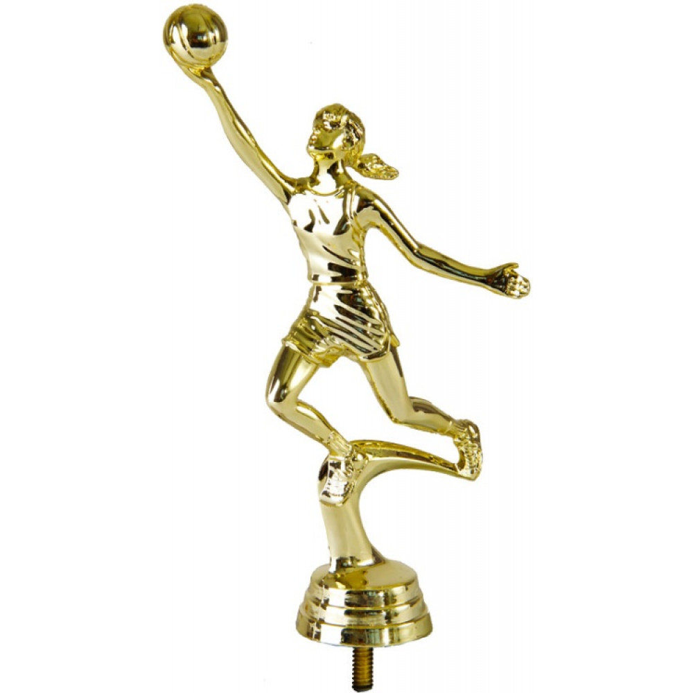 Цвет: золото, материал: пластик. Вид спорта: баскетбол. Фигурка выполнена в виде спортсменки-баскетболистки. Её правая рука с мячом вытянута вверх, ноги согнуты для прыжка. Волосы отброшены назад встречным ветром. Голова женщины поднята вверх, взгляд направлен на цель. Кажется, ещё секунда и мяч окажется в кольце. На женщине надета спортивная майка и шорты. Фигура находится на объёмном элементе, выполненном в виде полумесяца. Ниже - круглое основание, на котором имеются горизонтальные линии. Высота, см: 17.1 Вес, кг: 0.042. Фигурку возможно закрепить на цоколь, постамент или кубок.