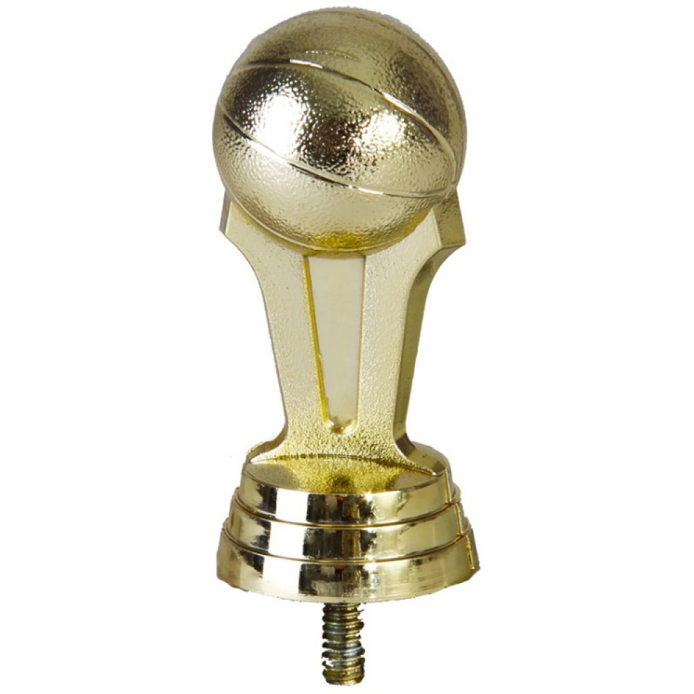 Цвет: золото, материал: пластик. Вид спорта: баскетбол. Фигурка выполнена в виде перевёрнутого вытянутого конуса. Вверху края скошены под наклоном. Верх фигурки украшает объёмный баскетбольный мяч, украшенный линими вдоль. Фигурка выполнена в золотом цвете, что придаёт ей роскоши и уникальности. Ниже - круглое основание, на котором имеются горизонтальные линии. Высота, см: 7.6 Вес, кг: 0.035. Фигурку возможно закрепить на цоколь, постамент или кубок.