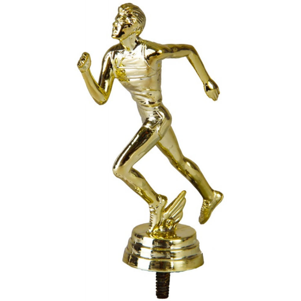 Цвет: золото, материал: пластик. Вид спорта: бег. Фигурка выполнена в виде мужчины-бегуна. Кажется, что он бежит дистанцию на соревнованиях. Его руки согнуты в локтях и расположены параллельно телу. Левая нога согнута в колене, правая находится в воздухе. Голова бегуна приподнята, взгляд направлен прямо на цель. Высота, см: 11.4 Вес, кг: 0.029. Фигурку возможно закрепить на цоколь, постамент или кубок.