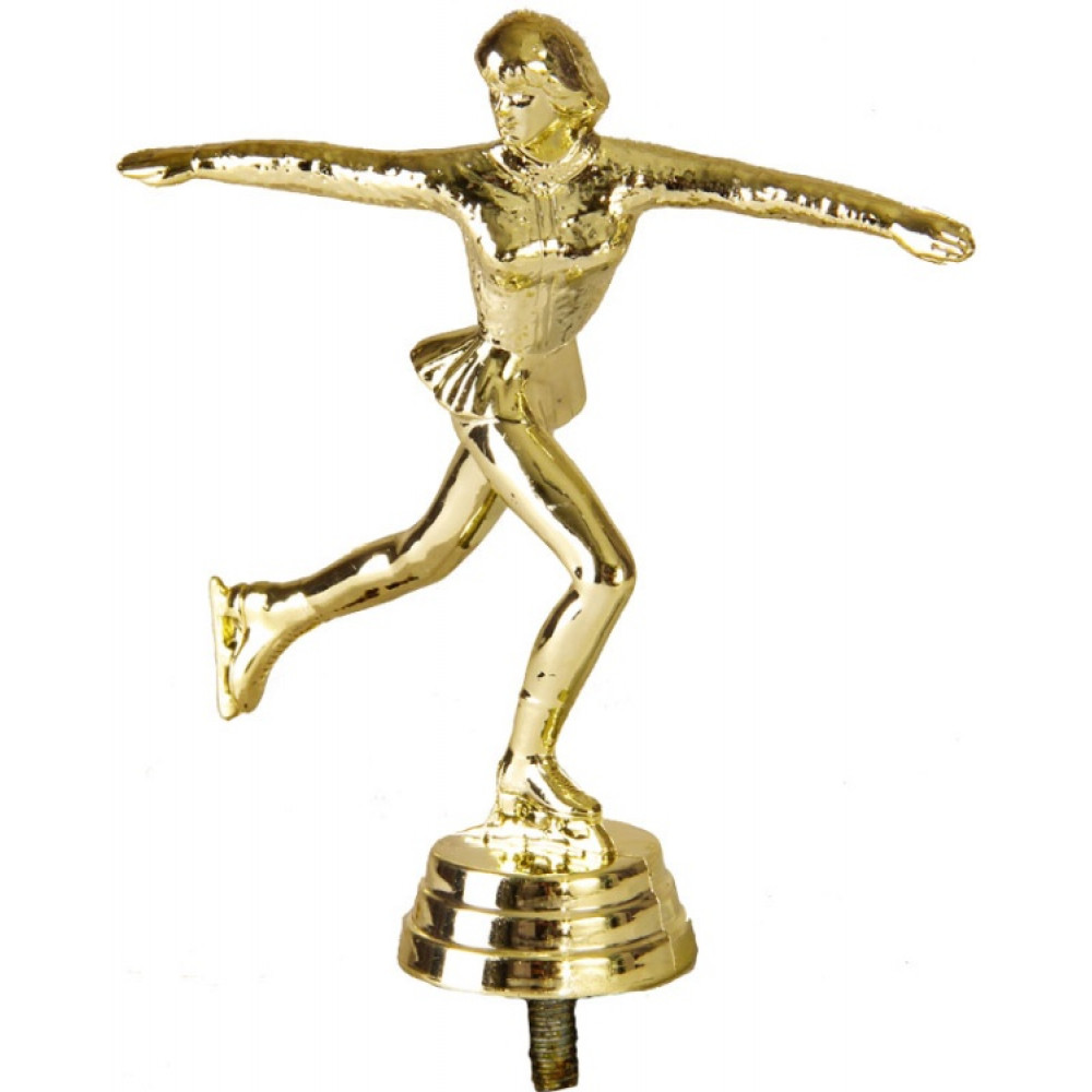 Материал пластик, цвет золото. Вид спорта: фигурное катание. Фигурка выполнена в виде женщины на коньках, заходящей на прыжок. Её левая нога согнута в колене, а правая замерла сзади в воздухе. Корпус фигуристки повернут в бок, руки расставлены по сторонам. Волосы коротко подстрижены в каре. Она одета в платье с короткой плиссированной юбкой. Высота фигурки, см: 11.4 Фигурку возможно закрепить на цоколь, постамент или кубок.
