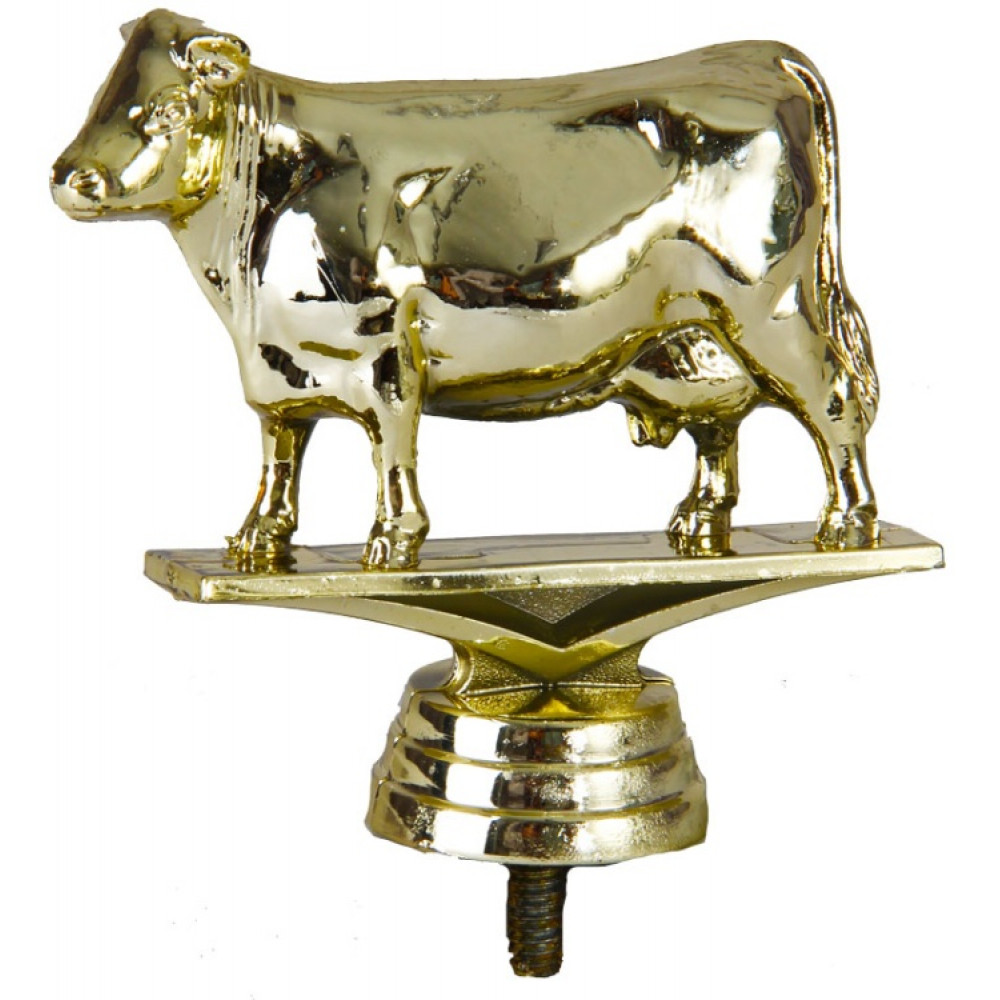 Цвет: золото, материал: пластик. Тема: корова. Фигурка выполнена в виде коровы. Её длинный хвост с пушистой кисточкой опущен вниз. Возле задних ног имеется вымя, полное молока. Короткие уши расставлены в строну, словно корова прислушивается. Ноздри широко раздуты. Корова находится на тонкой прямоугольной пластине, которая служит имитацией земли. Ниже - круглое основание, на котором имеются горизонтальные линии. Высота, см: 8.9. Фигурку возможно закрепить на цоколь, постамент или кубок.