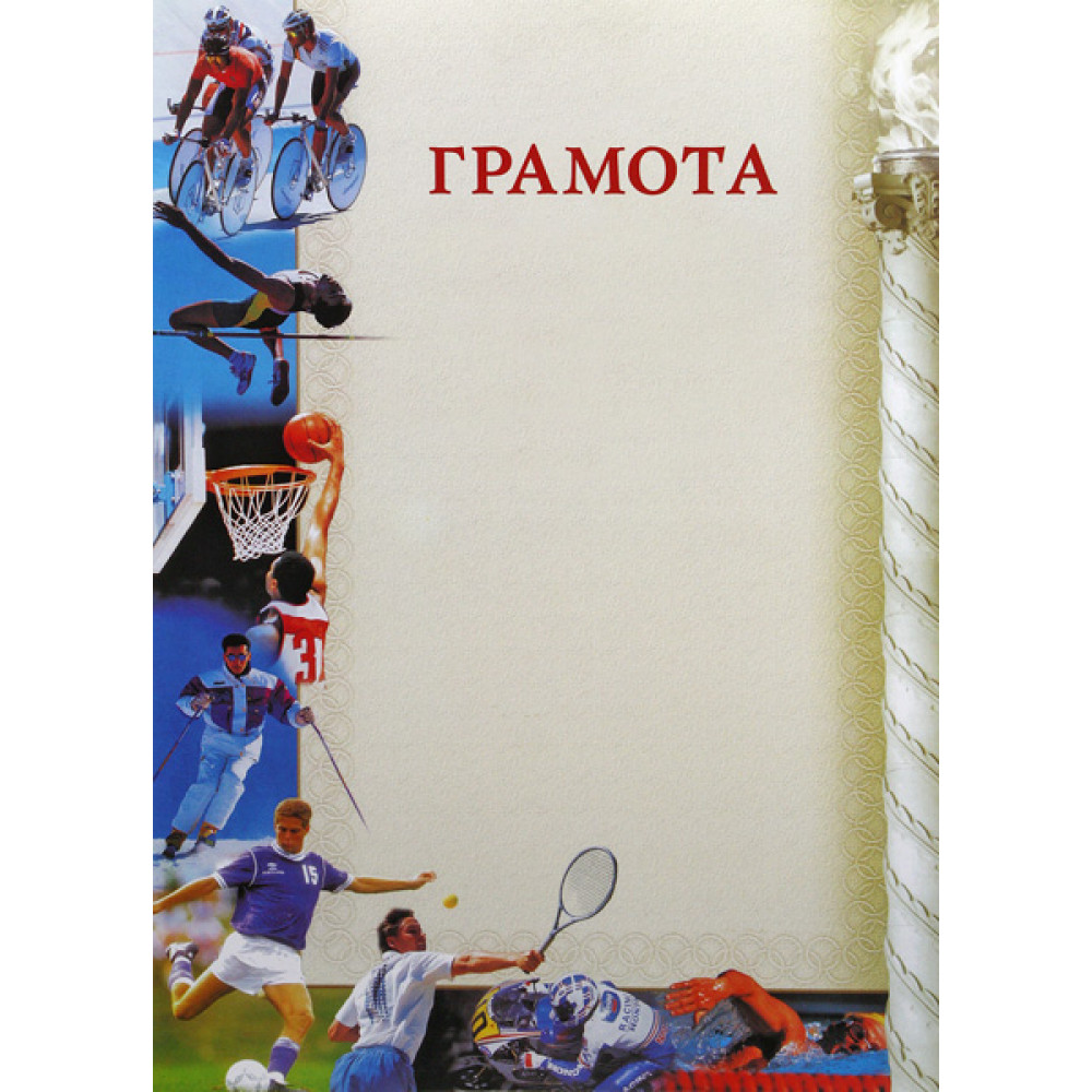 Грамота, формат А4. Бумага матовая, толщина 200 гр, полноцветная печать. ¶Преобладающий фон грамоты бежевого цвета. С правой стороны во всю высоту грамоты расположен факел в виде бетонной колонны, украшенной узором, обвивающим колонну. На вершине колонны изображен огонь. Данное изображение выполнено в бежевом цвете. С левой стороны и снизу расположена полоса ярко-голубого цвета с изображение спортсменов. Сверху вниз изображены: велосипедисты, легко-атлет, прыгающий в высоту, баскетболист, лыжник, футболист. По крайней нижней части расположены: теннисист, мотоциклист, пловец. В верхней части бежевого фона размещено слово: грамота, красного цвета.