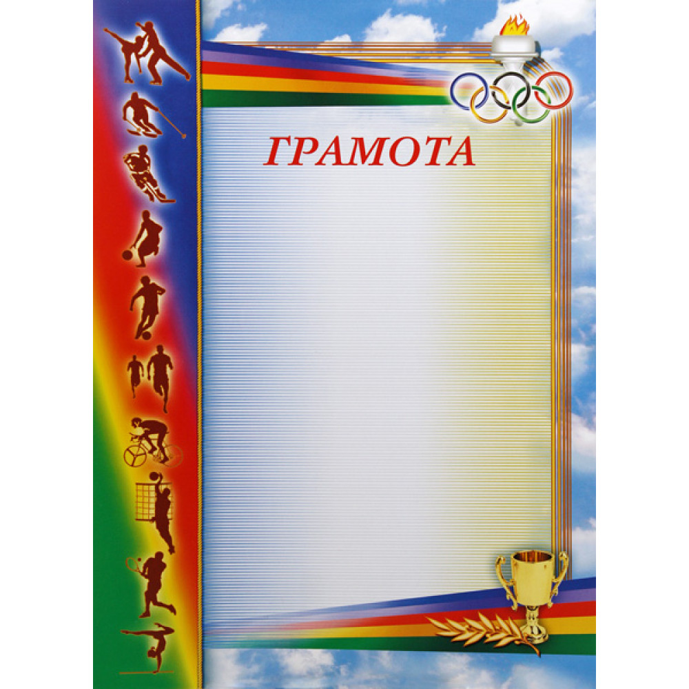 Грамота, формат А4. Бумага матовая, толщина 200 гр, полноцветная печать.¶На грамоте изображено небо с облаками. С левой стороны изображена широкая полоса с радужным окрасом, на ней изображены силуэты спортсменов. По центру изображен прямоугольник, стороны в виде тонких золотистых линий с закругленными углами. В нижней части находится пятицветная лента с золотым кубком и золотой лавровой веточкой. В верхней части находится пятицветная лента с олимпийским факелом и кольцами. ниже изображено слово "Грамота" красным цветом.
