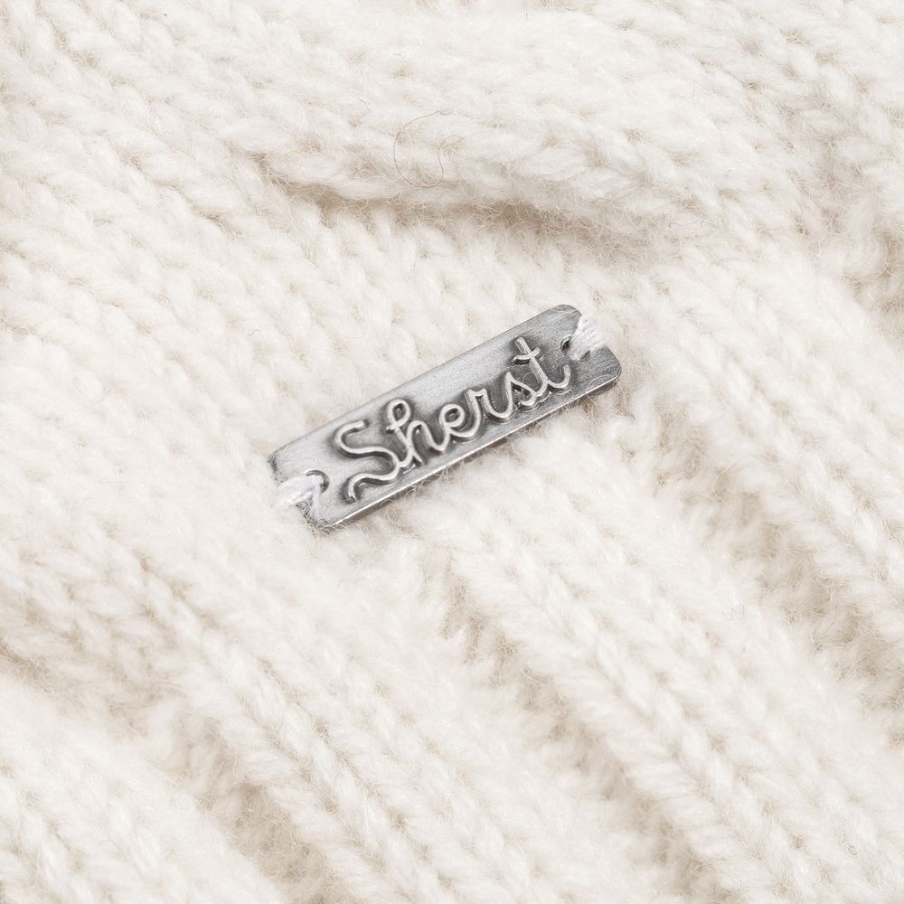 Металлический шильд с названием бренда расположен по нижнему краю изделия, что оставляет достаточно места для пришива лейбла или шильда с логотипом заказчика.