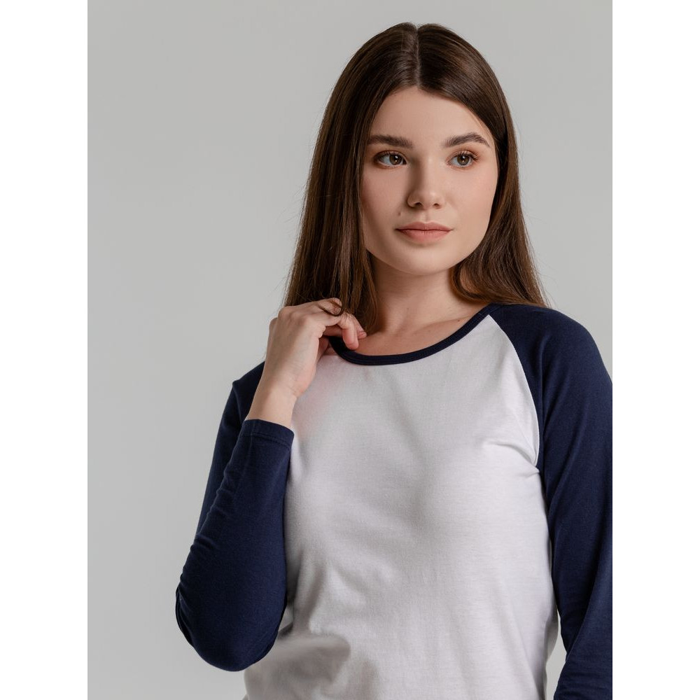 Женская двухцветная футболка с боковыми швами, длинным рукавом реглан и закругленным низом.
