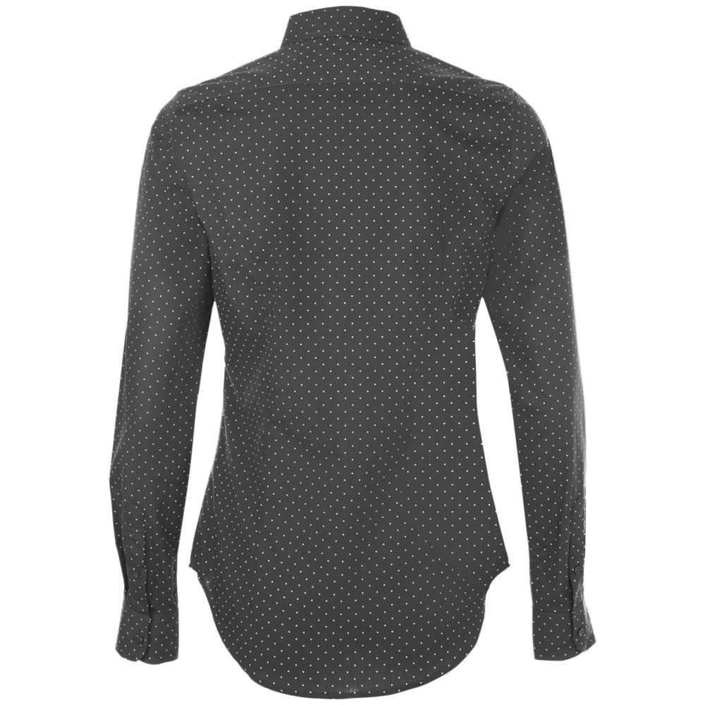 Модная рубашка с печатным рисунком в горошек, которая прекрасно впишется в современный корпоративный стиль.Приталенная модель с нагрудными вытачками, маленьким классическим воротничком, планкой с 7 пуговицами тон в тон и манжетами на 1 пуговице с разрезом «капуцин».