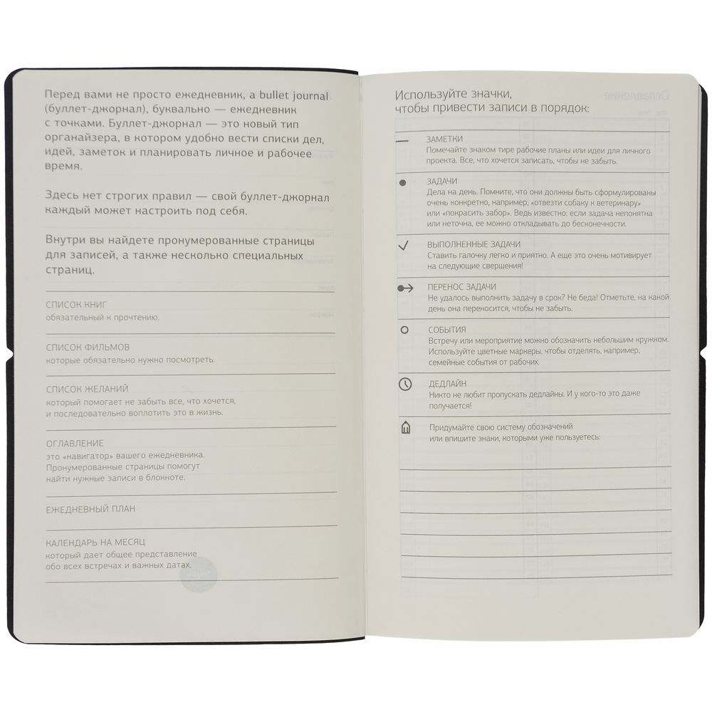 Bullet journal (буллет-джорнал, буквально — ежедневник с точками) — это новый тип органайзера, в котором удобно вести списки дел, идей, заметок и планировать личное и рабочее время. Здесь нет строгих правил — свой буллет-джорнал каждый может настроить под себя.