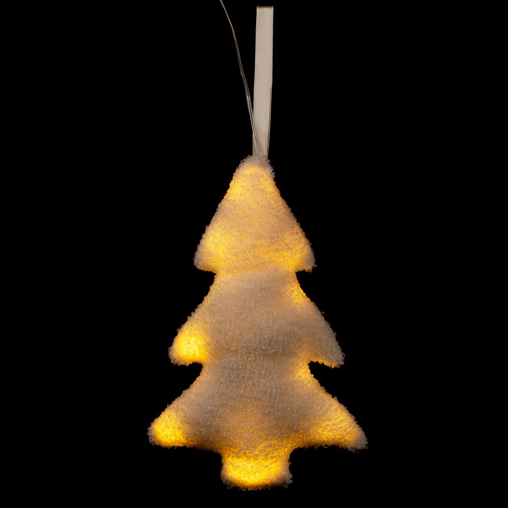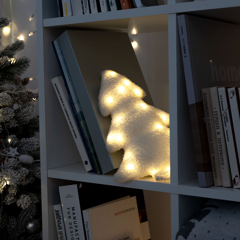 Внутри мягкой елочки находится миниатюрная гирлянда с теплым светом. Работает от 2 батареек типа CR2032 (входят в комплект).