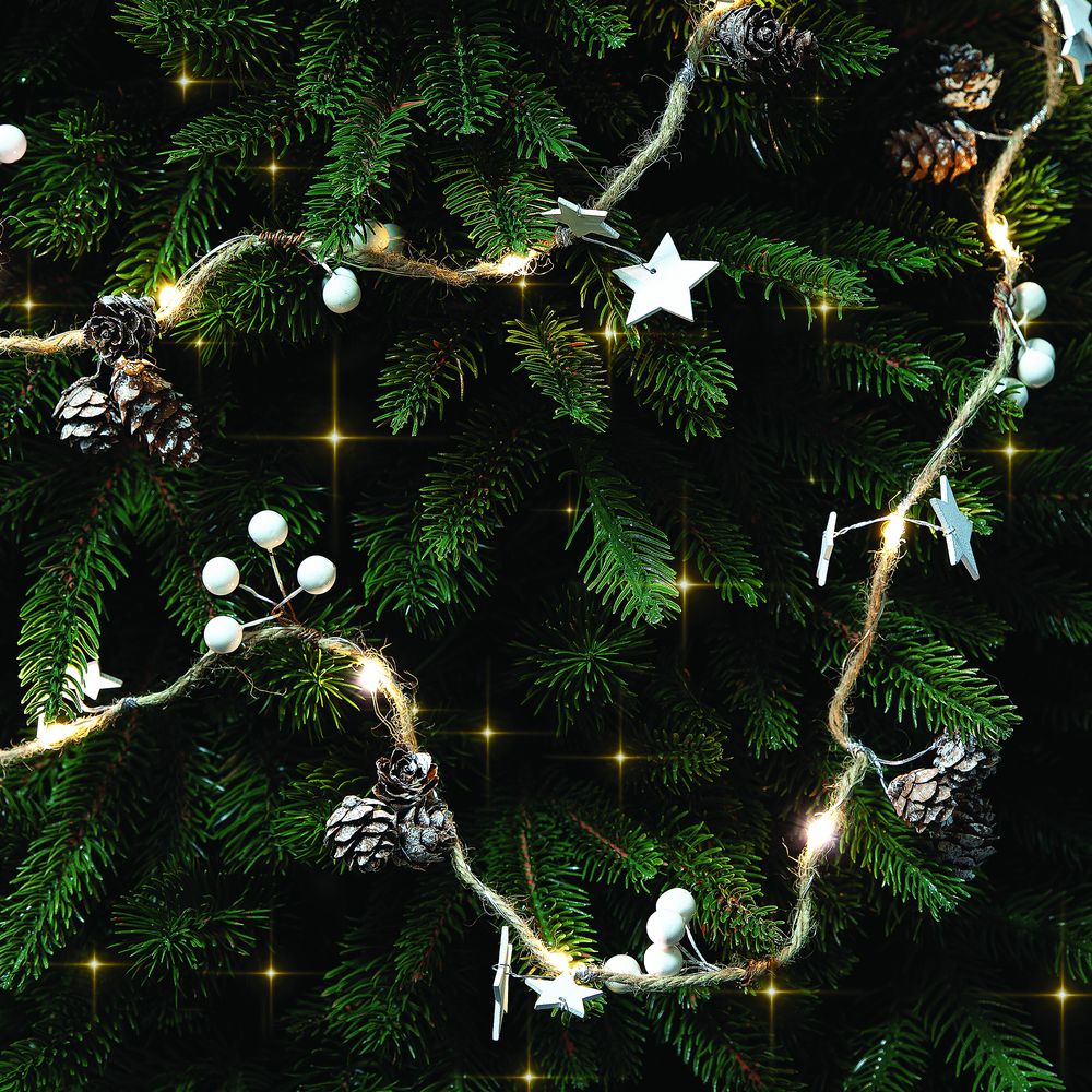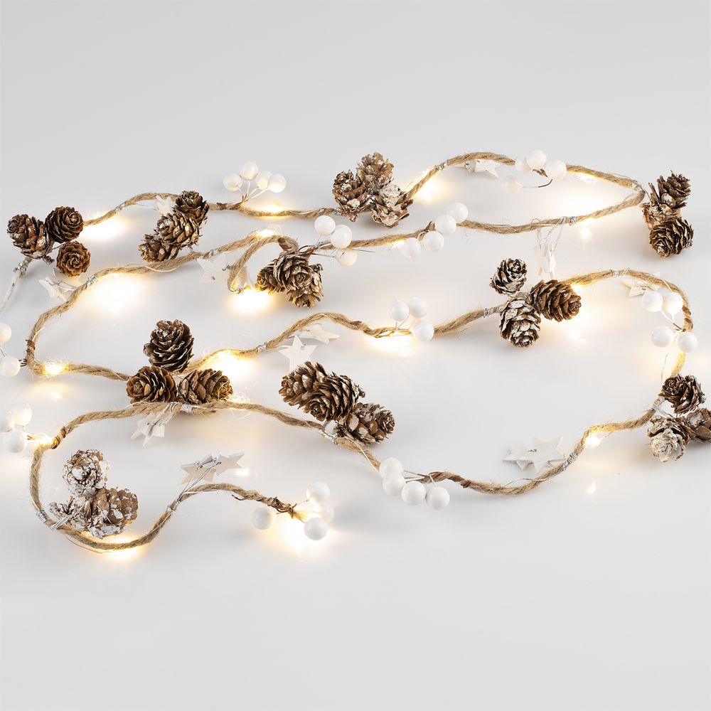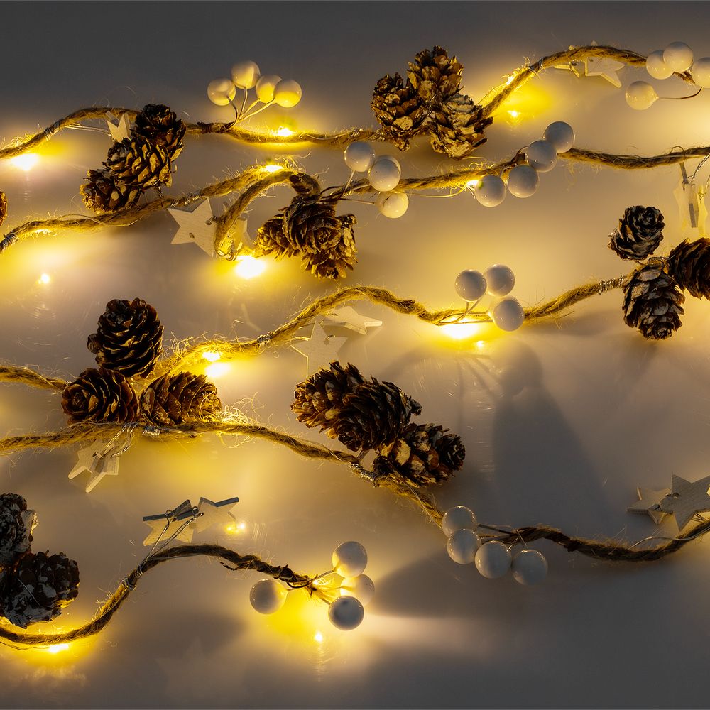 Шишки, бусины, звездочки и 20 лампочек с теплым светом. Работает от 3 батареек АА (в комплект не входят).