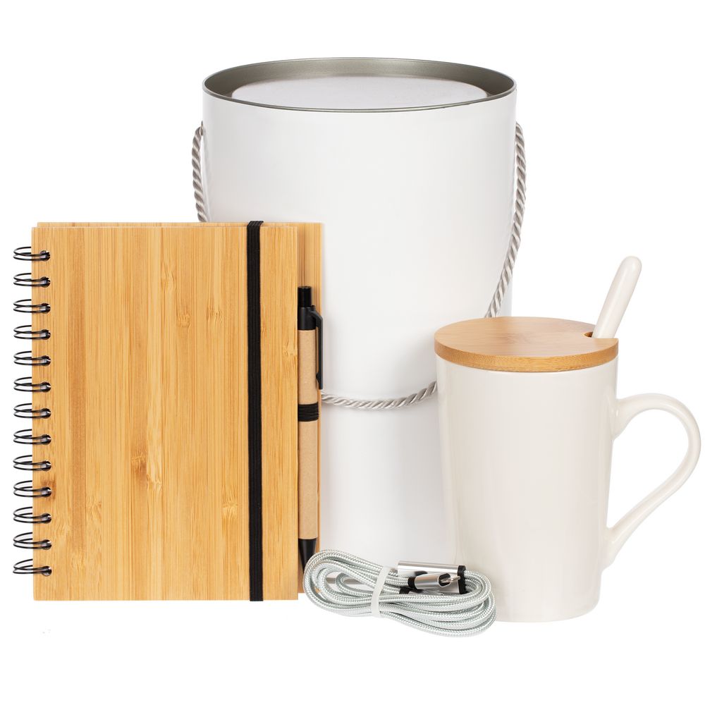 Стильный и лаконичный набор для комфортного пребывания в офисе: продуманная кружка для расслабленного кофе-брейка, оригинальный супертвердый бамбуковый блокнот на кольцах для самых важных записей (и эффектной гравировки!), а также прочный кабель с тремя разъемами — чтобы всегда оставаться на связи.