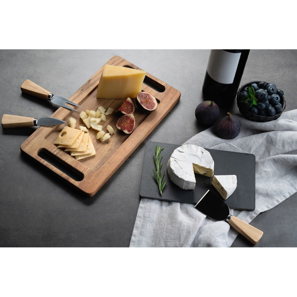 Поднос и рукоятки ножей выполнены из дерева акации, лезвия — из высококачественной нержавеющей стали.