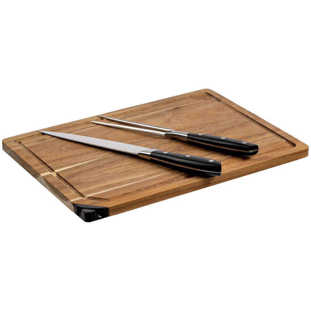 Доска изготовлена из акации — твердого и прочного дерева, привлекающего внимание своей живописной, неповторимой текстурой. Отличительной особенностью доски является встроенная точилка для ножей, которой удобно пользоваться во время готовки.