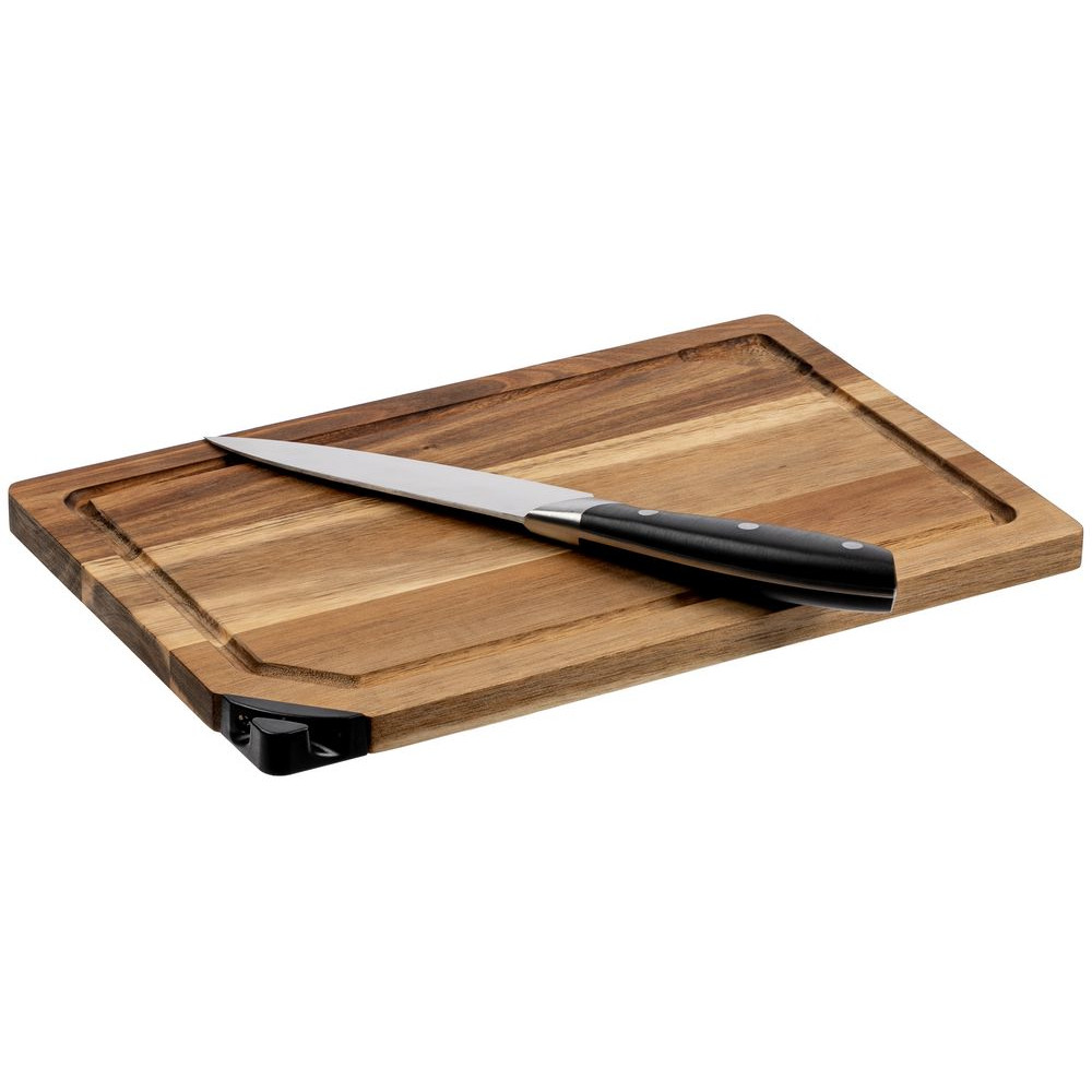 В угол доски встроена точилка для ножей, которой удобно пользоваться, не отвлекаясь от процесса готовки.Доска изготовлена из акации. Посуда из этого твердого и прочного материала долго не теряет внешний вид, не впитывает запахи и влагу, а живописная текстура делает каждый предмет неповторимым.