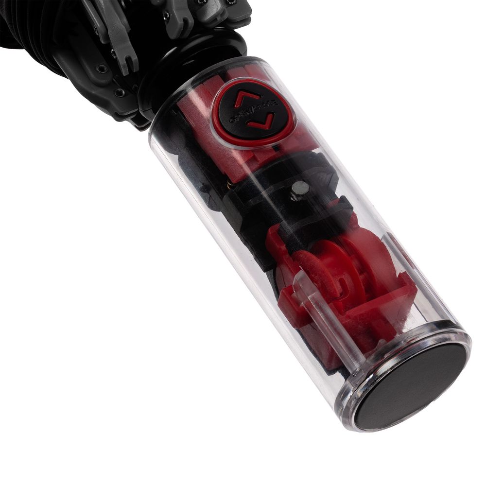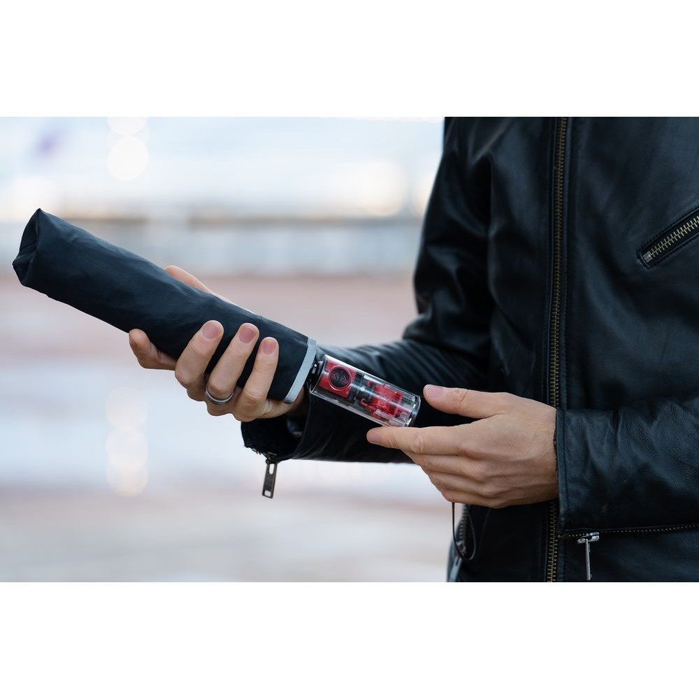 Складной зонт Futurum привлекает внимание оригинальным дизайном. Складываясь после дождя, он прячет мокрую поверхность в себя, а сухая остается снаружи. Светоотражающий кант и ручка из прозрачного пластика, не скрывающая ярких деталей внутри, добавляют внешнему виду зонта футуристичности.