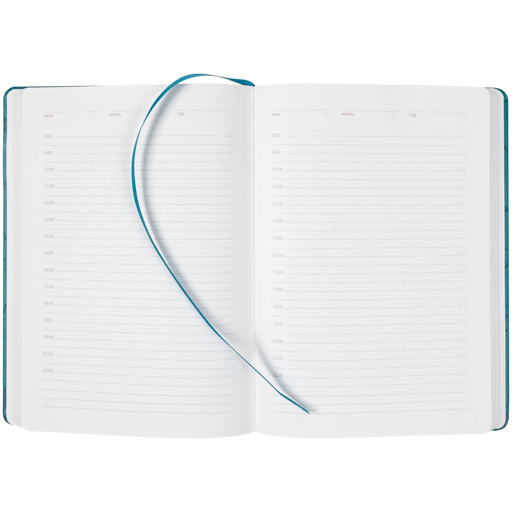 Ежедневник с твердой обложкой, выполнен из материала Brand, цвет морской волны II, с тиснением и выборочным УФ-лаком. Дополнен ляссе в цвет обложки.