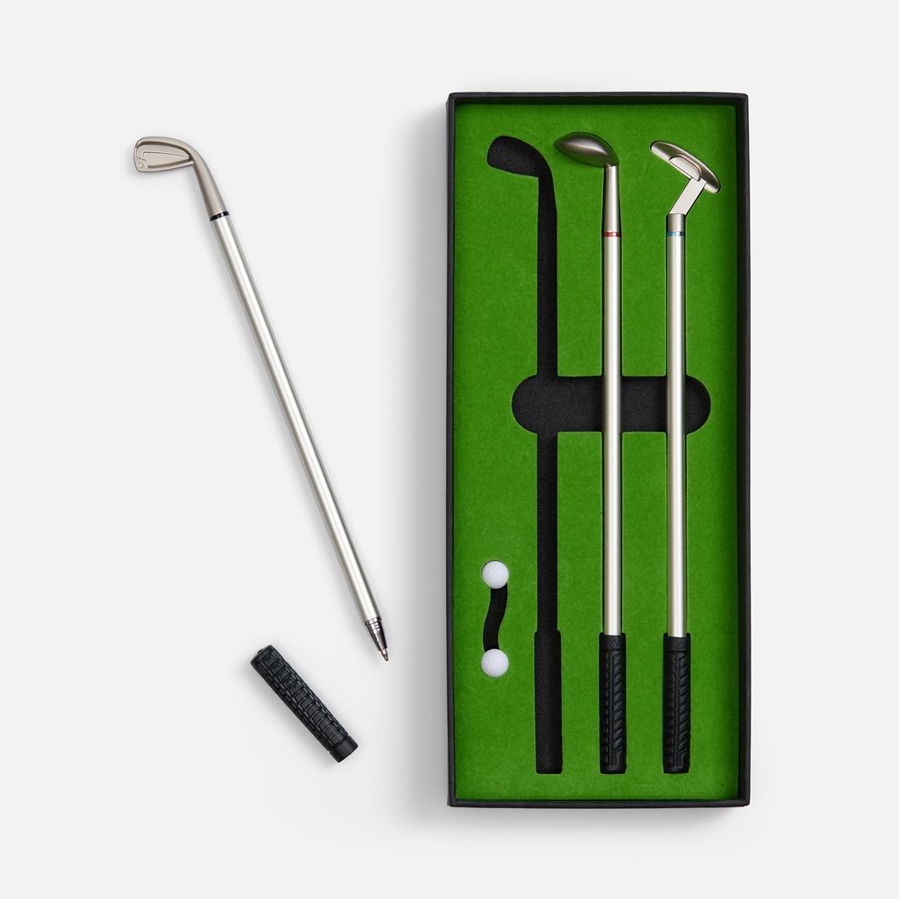 В комплекте: 3 клюшки-ручки со сменным стержнем с синими, черными и красными чернилами, 2 мячика для гольфа, флажок и подарочная коробка.Не является детской игрушкой. Не предназначено для детей!