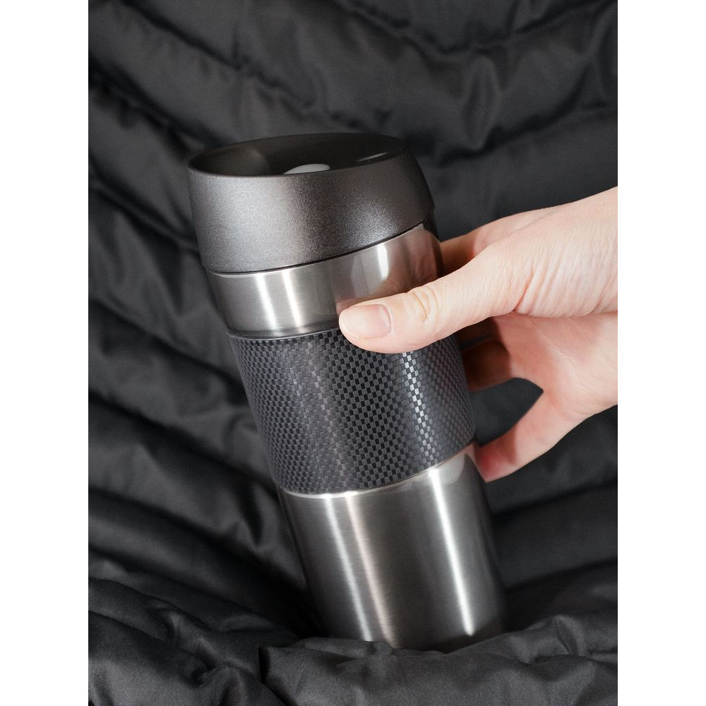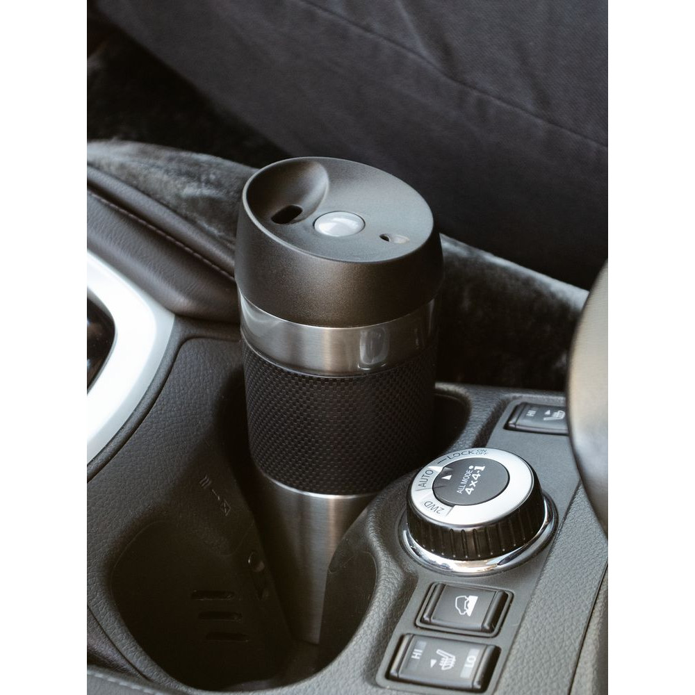 Удобная крышка с кнопкой-закрывашкой и силиконовая манжета на корпусе — все, что нужно, чтобы максимально комфортно пить чай или кофе в дороге.