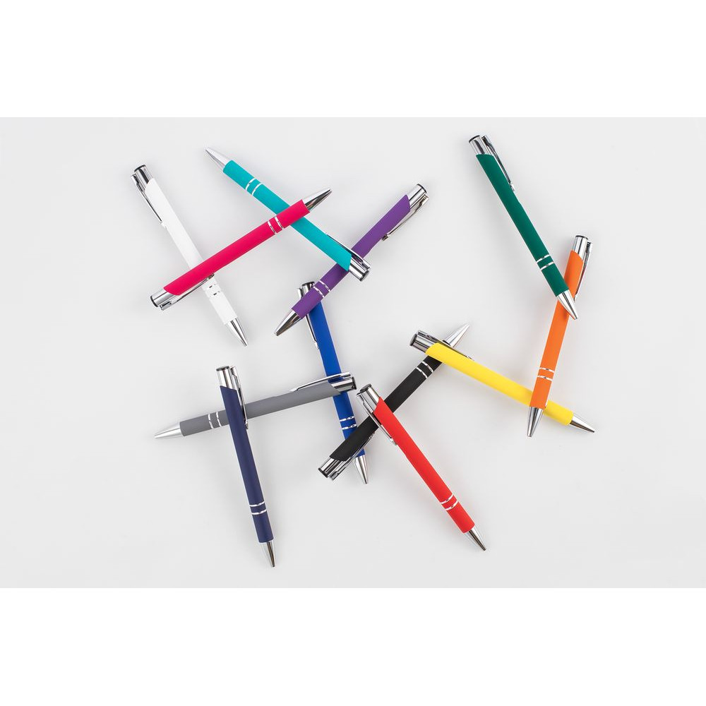 Яркая шариковая ручка с цветным покрытием софт-тач и хромированными деталями.