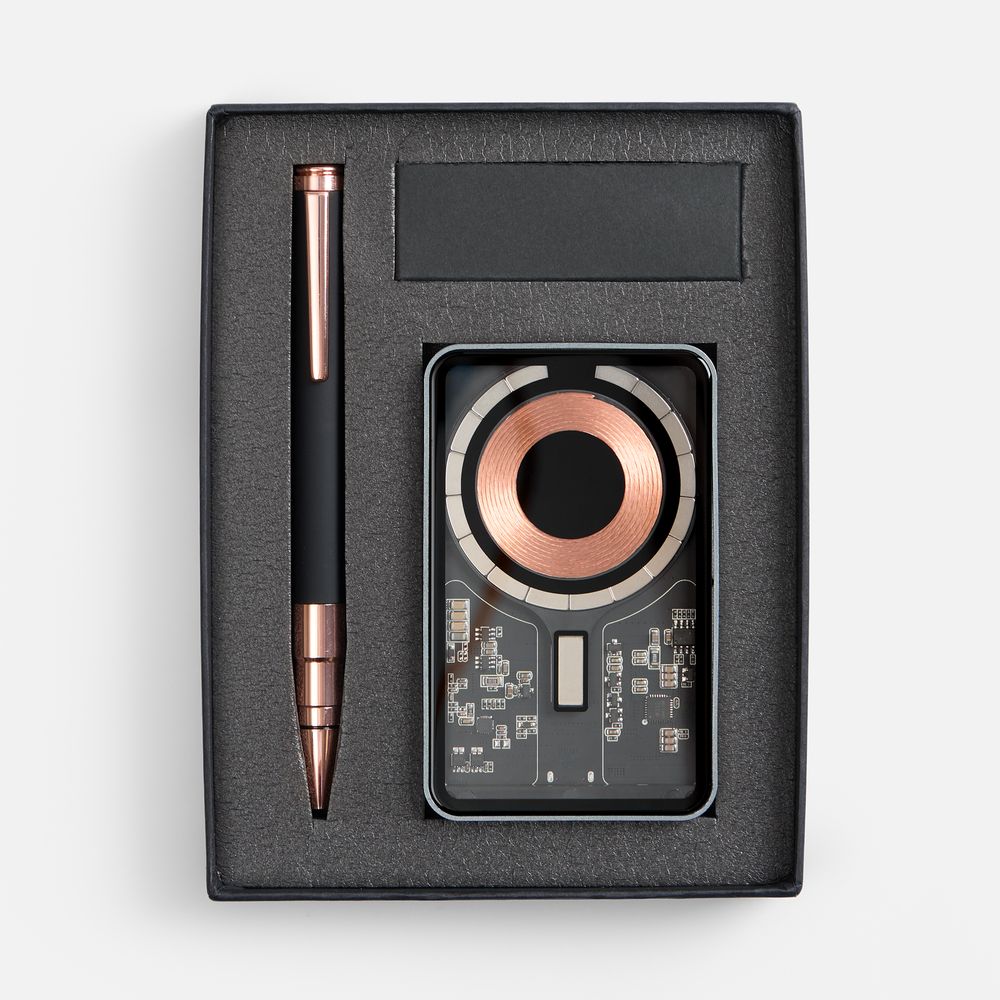 Необычный беспроводной аккумулятор Cooper Ergo и увесистая ручка Kugel Rosegold составляют вместе идеальный дуэт — с легким оттенком стильного стимпанка и намеком на прогрессивность. Набор станет идеальным подарком как для коллег, так и для руководителей, и покорит получателей оригинальностью и новизной исполнения.