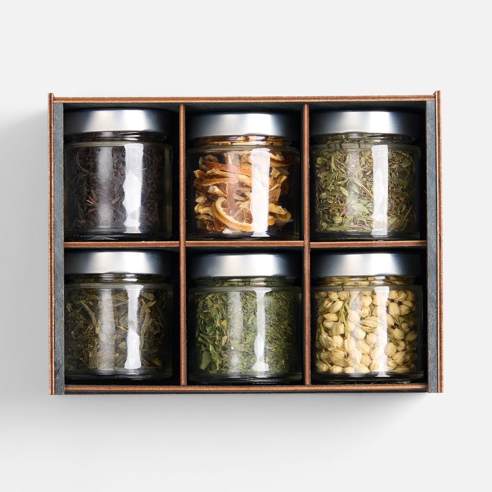 Бутоны жасмина наполняют напиток тонким цветочным ароматом, сушеная мелисса вносит легкую цитрусовую свежесть, чабрец придает пряную нотку, а дольки апельсина — яркую фруктовую кислинку. Смешивая эти ингредиенты на свой вкус, можно стать настоящим чайным мастером, — и каждый раз будет получаться уникальное сочетание, которое отразит текущие предпочтения и настроение. Деревянная коробка‑пенал придает подарку благородный и экологичный вид.