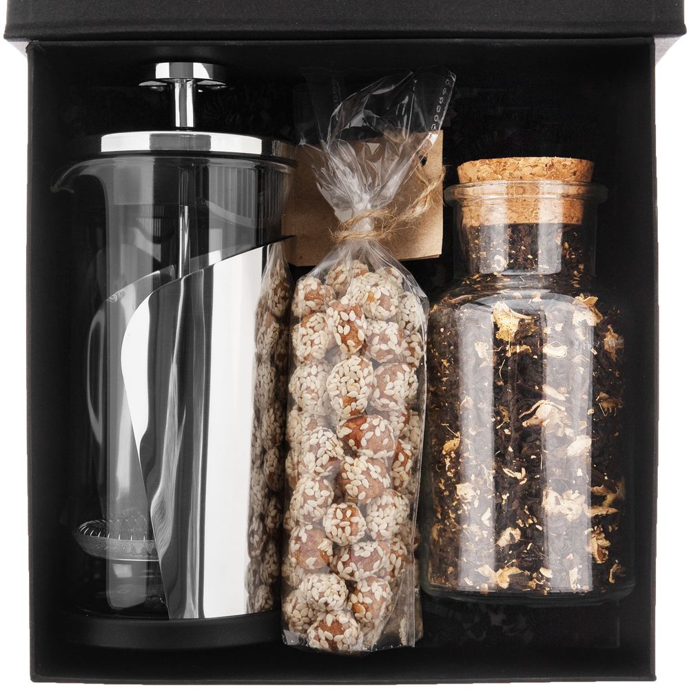 Набор Teacode — прекрасный подарок ценителям чая и всем неравнодушным к хрустящим снекам. Сладкий арахис в кунжуте, ароматный, пропитанный соком имбиря чай и френч-пресс для заваривания гарантированно обеспечат заряд энергии и хорошего настроения. А довершает композицию вкуснейшего набора стильная упаковка.