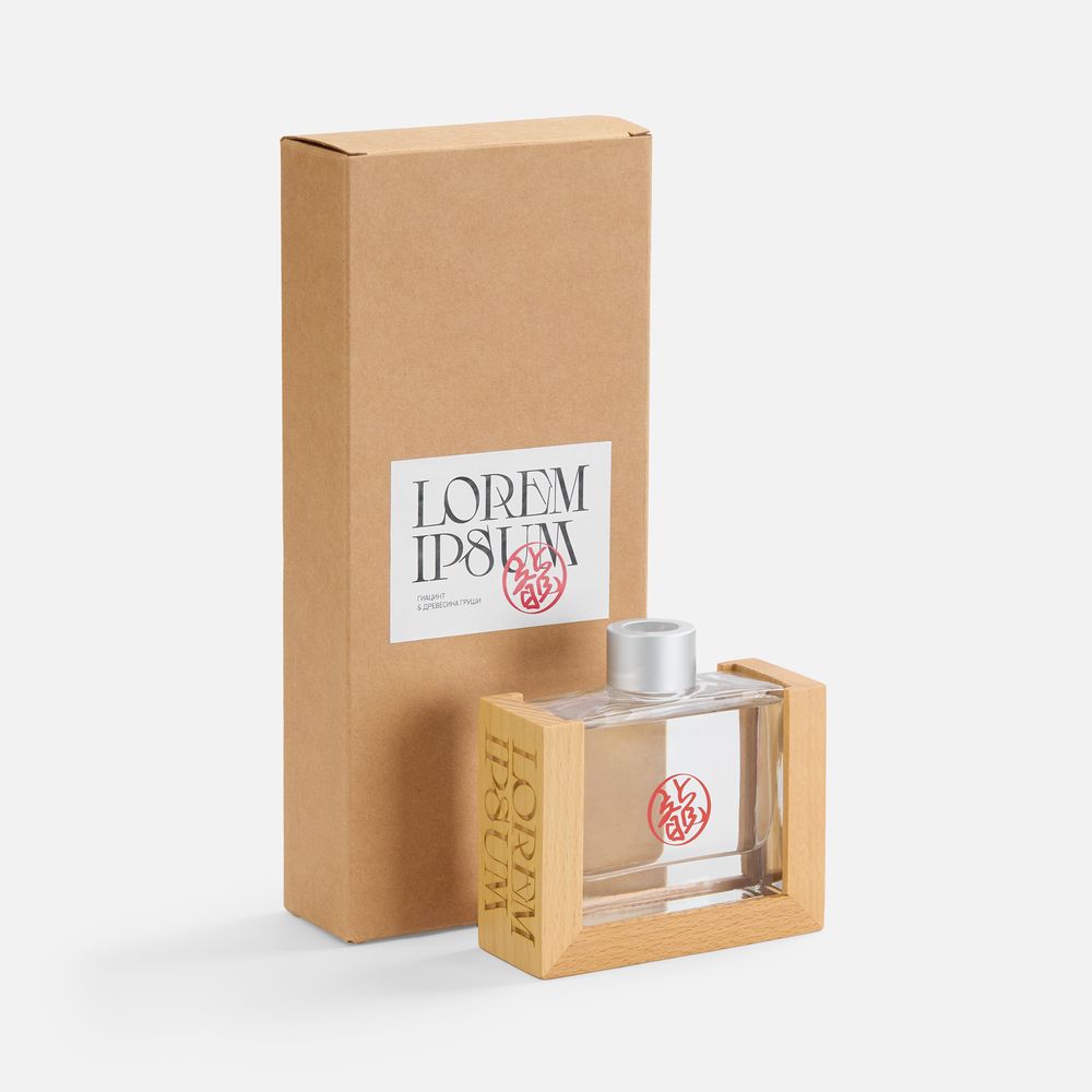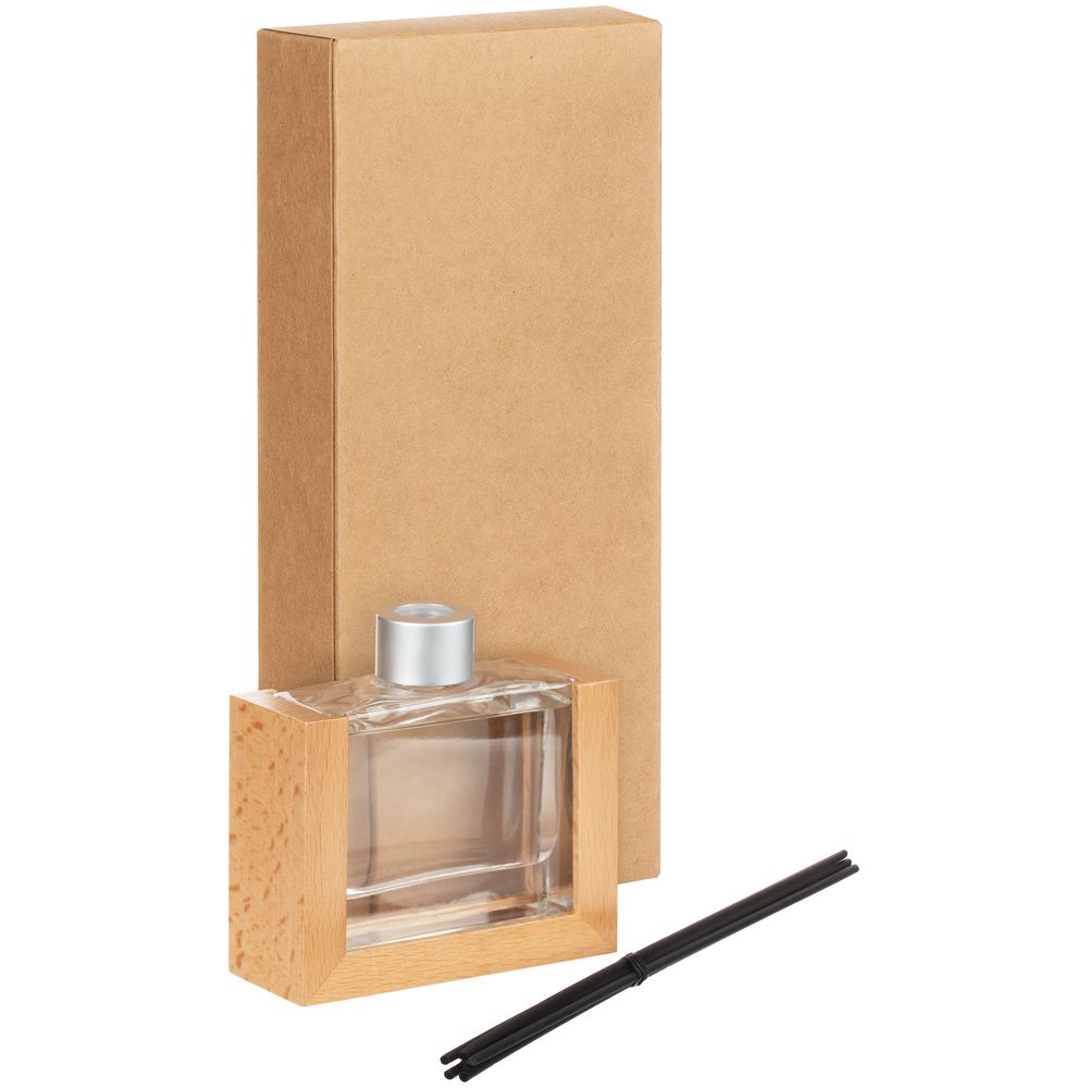 Изящный стеклянный флакон в обрамлении натурального дерева станет стильным элементом декора.